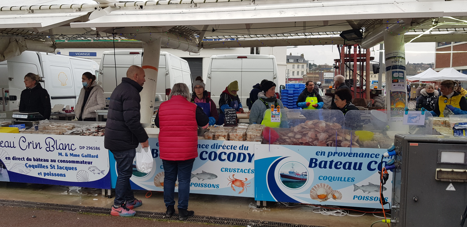 In Dieppe staunen wir wieder nicht schlecht. Ein teurer Stellplatz und ziemlich eng und voll. Nicht unser. Wir parken außerhalb und gehen zu Fuß – insgesamt 7 km. Im Hafenbereich findet ein Heringsfest statt, wie wir auf Ankündigungen lesen, an den kommenden Wochenenden auch woanders, offensichtlich Tradition. Viele Stände bieten Heringe vom Grill an und – eine Spezialität der Region – Jacobsmuscheln. Die müssen wir probieren.