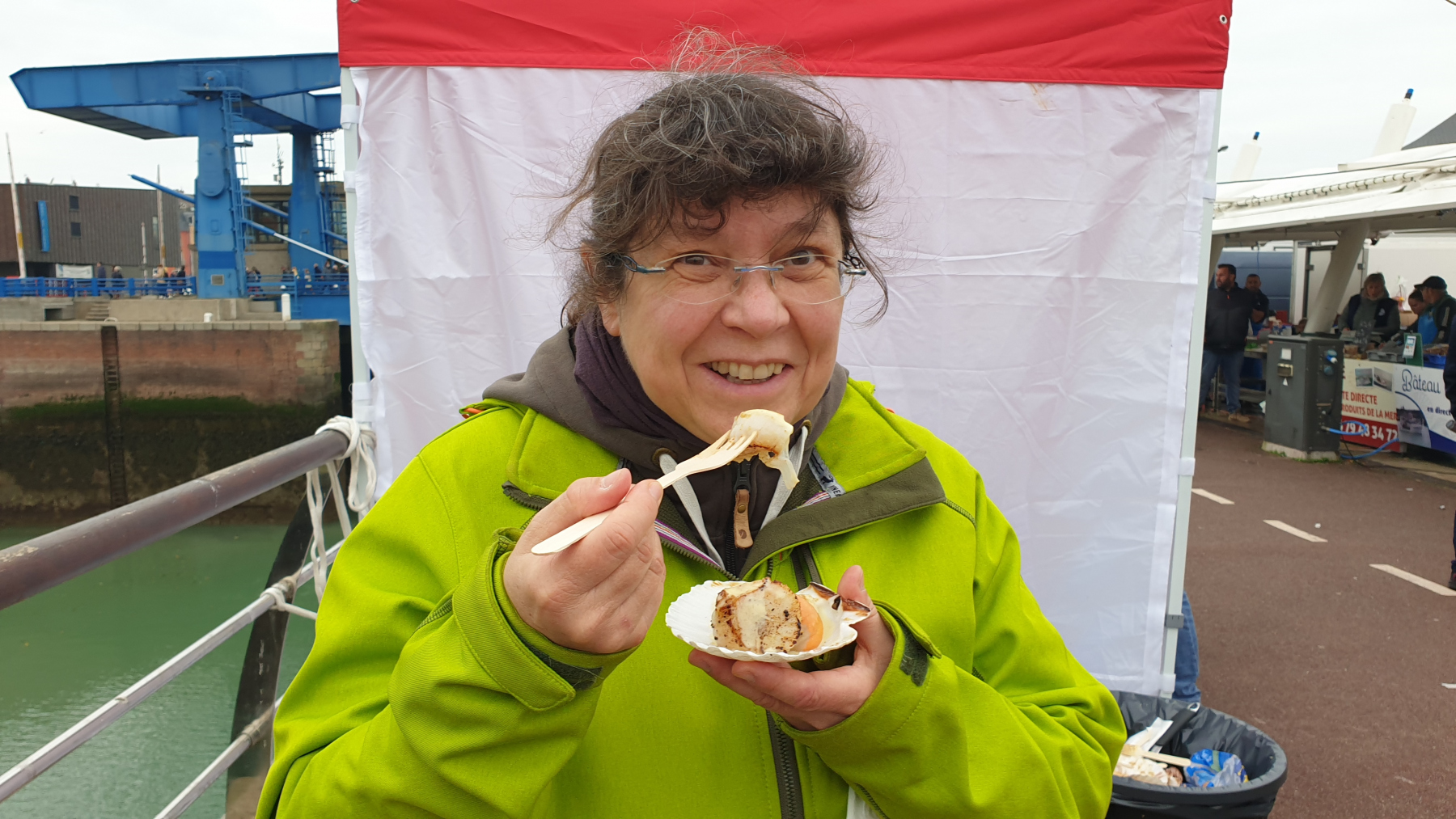 In Dieppe staunen wir wieder nicht schlecht. Ein teurer Stellplatz und ziemlich eng und voll. Nicht unser. Wir parken außerhalb und gehen zu Fuß – insgesamt 7 km. Im Hafenbereich findet ein Heringsfest statt, wie wir auf Ankündigungen lesen, an den kommenden Wochenenden auch woanders, offensichtlich Tradition. Viele Stände bieten Heringe vom Grill an und – eine Spezialität der Region – Jacobsmuscheln. Die müssen wir probieren.