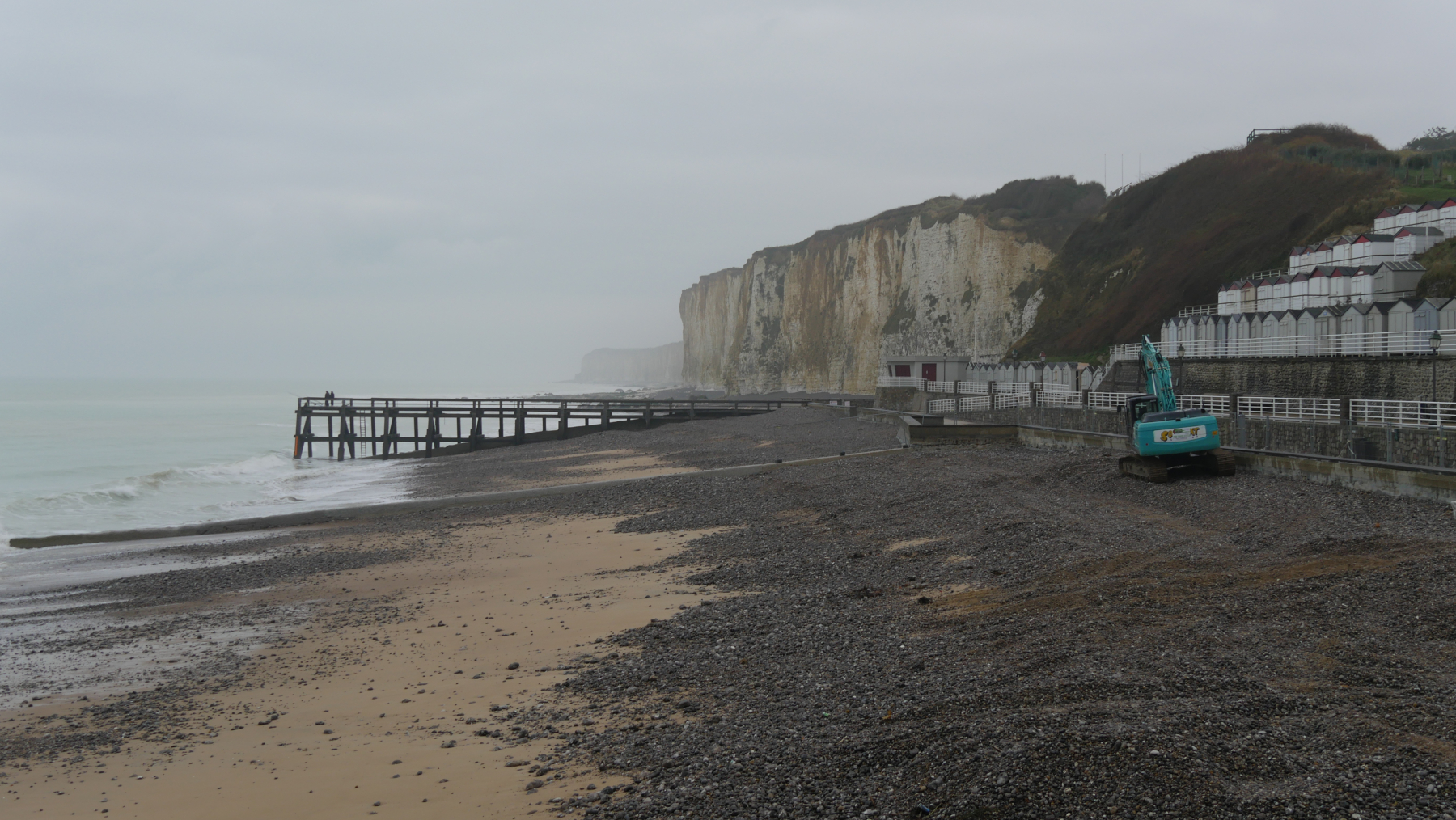 Auf geht’s an die Küste. Das erste Ziel ist Le Treport. Nicht das wir naiv sind. Aber wir haben November und befinden uns in nördlichen Breitengraden. Also rechnen wir natürlich mit einer geringen Frequenz von Besuchern. Wir staunen nicht schlecht. Der Stellplatz ist mit einem Schild versperrt und völlig überfüllt. Bereits auf der Zufahrtsstraße hätten wir damit rechnen müssen – überall parken Wohnmobile. Es soll noch einen anderen Stellplatz geben, also weiter. Das Navi führt uns durch den auch mit Menschen vollen Ort. Wir folgen eine Steigung hoch – eine enge Kurve – ja wir kommen rum, fahren auf den Kreisverkehr: erste Ausfahrt Maximale Fahrzeugbreite 1,80 m, zweite Ausfahrt gegen die Einbahnstraße und die dritte auch. Also die 360 Grad rum und wieder runter und dem Pier entlang. Auf der rechten Seite stehen ein paar Wohnmobile vor einer Festhalle. Nix wie hin und sieh da wir finden einen Platz. Am Abend werden es insgesamt rund 20 Mobile und der Platz ist voll.