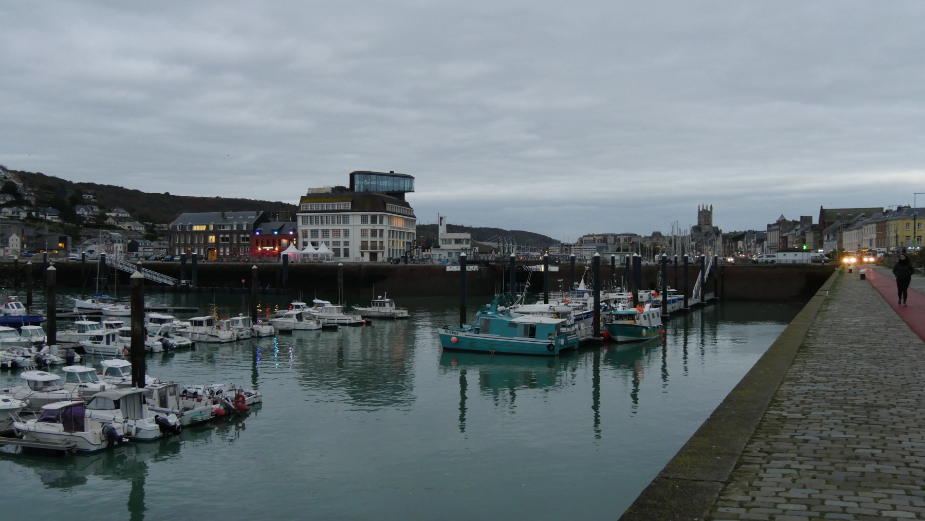 Auf geht’s an die Küste. Das erste Ziel ist Le Treport. Nicht das wir naiv sind. Aber wir haben November und befinden uns in nördlichen Breitengraden. Also rechnen wir natürlich mit einer geringen Frequenz von Besuchern. Wir staunen nicht schlecht. Der Stellplatz ist mit einem Schild versperrt und völlig überfüllt. Bereits auf der Zufahrtsstraße hätten wir damit rechnen müssen – überall parken Wohnmobile. Es soll noch einen anderen Stellplatz geben, also weiter. Das Navi führt uns durch den auch mit Menschen vollen Ort. Wir folgen eine Steigung hoch – eine enge Kurve – ja wir kommen rum, fahren auf den Kreisverkehr: erste Ausfahrt Maximale Fahrzeugbreite 1,80 m, zweite Ausfahrt gegen die Einbahnstraße und die dritte auch. Also die 360 Grad rum und wieder runter und dem Pier entlang. Auf der rechten Seite stehen ein paar Wohnmobile vor einer Festhalle. Nix wie hin und sieh da wir finden einen Platz. Am Abend werden es insgesamt rund 20 Mobile und der Platz ist voll.