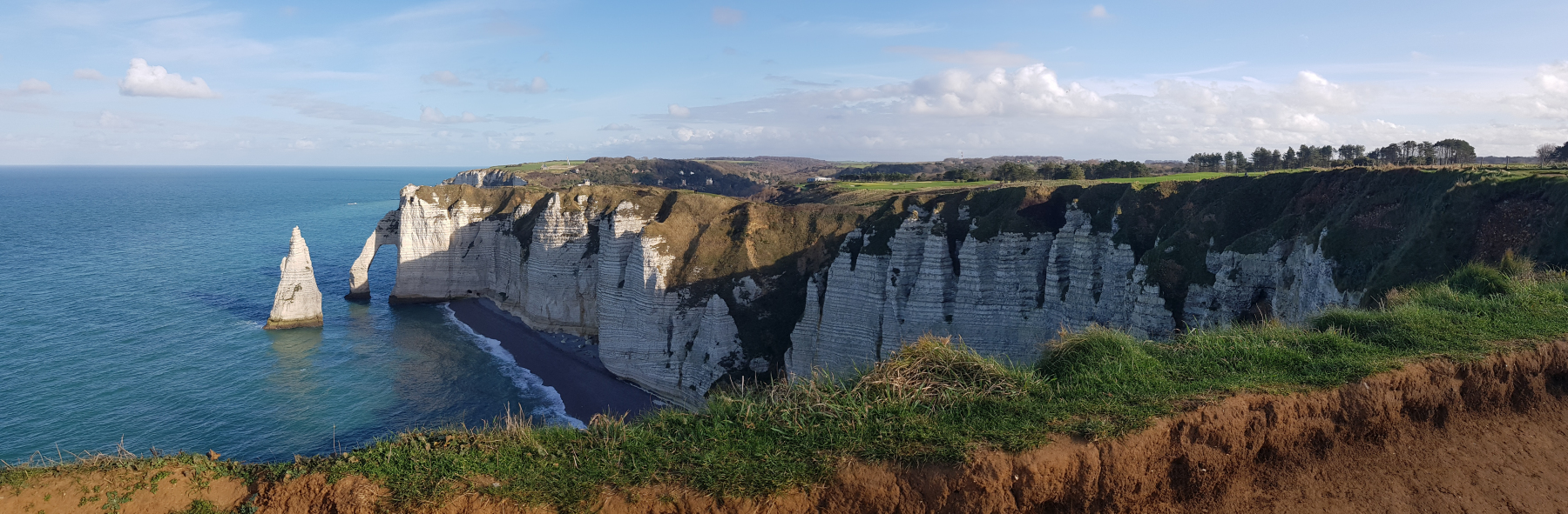 Etrètat kennt man wegen den Felsformationen. Bislang waren wir auch erst einmal da und haben die üblichen Fotos gemacht. Heute suchen wir uns über die App komoot eine kleine Wanderung von 5 km und klettern an der Küste und auf den bekannten Felsen selbst. Es lohnt sich.