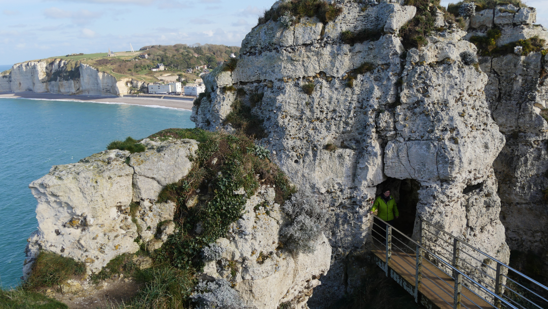 Etrètat kennt man wegen den Felsformationen. Bislang waren wir auch erst einmal da und haben die üblichen Fotos gemacht. Heute suchen wir uns über die App komoot eine kleine Wanderung von 5 km und klettern an der Küste und auf den bekannten Felsen selbst. Es lohnt sich.