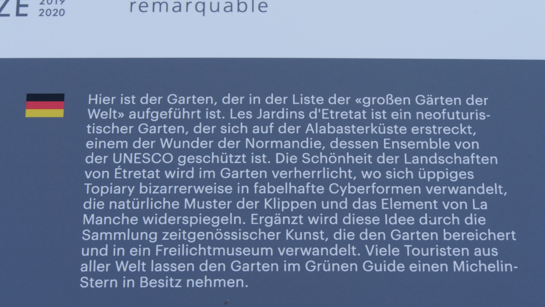 Unten im Ort angekommen gehen wir am Strand auf die andere Seite der Bucht. Da geht es halt hoch zur Kirche. Jetzt noch Lust hier auch noch hochzu“klettern“ und den Ausblick von der anderen Seite zu genießen? Komm wir sind jetzt hier und haben ja Zeit. Und da steht noch das Schild zu „Les Jardins d´Etretat“ inspiriert von Monet. Klingt doch interessant. Und das ist es wirklich!