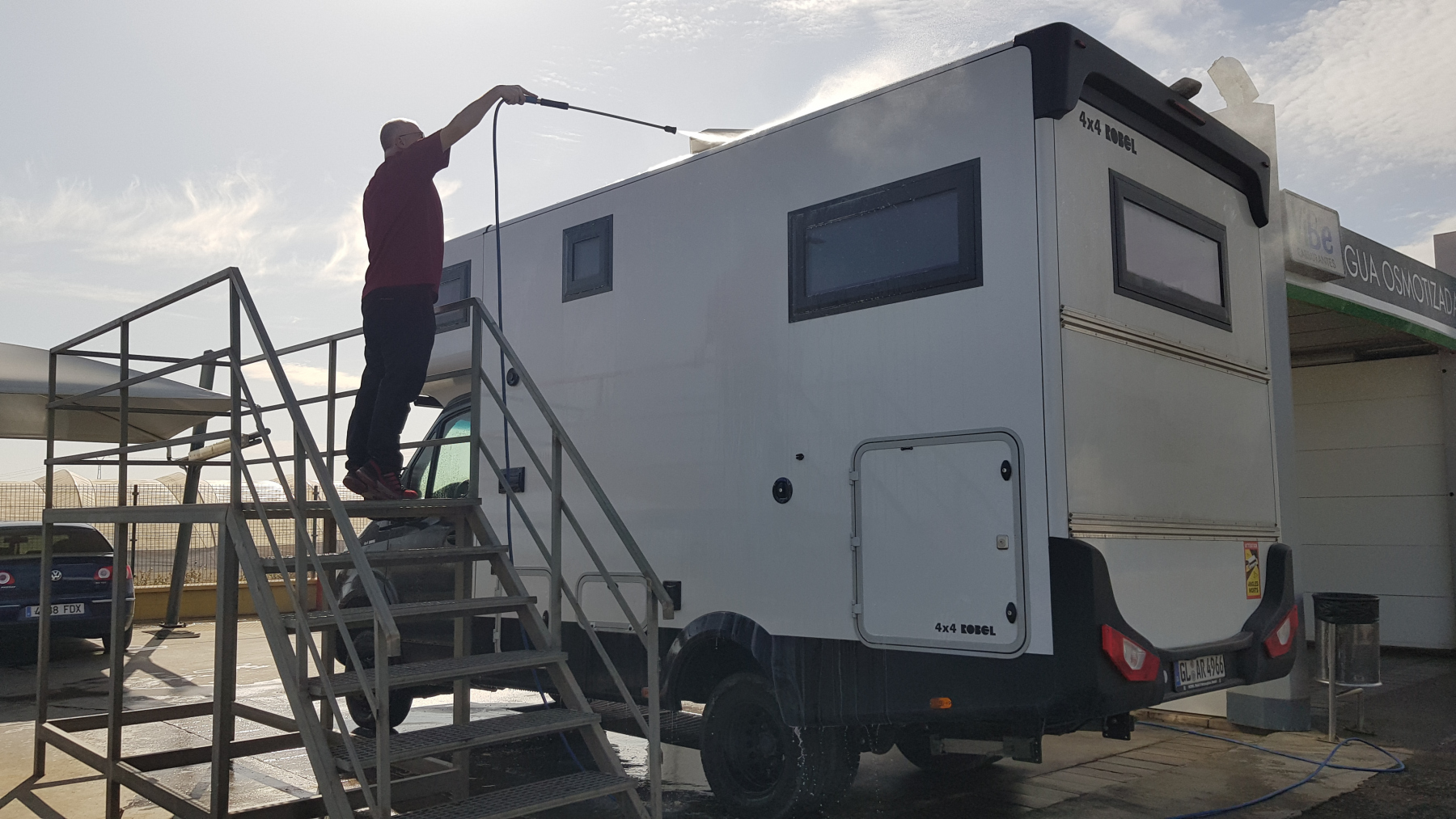 Wir fahren jetzt zunächst entlang der Costa de la Luz und wollen uns mal ein paar Plätze angucken. Sobald wir einen schönen finden, wollen wir eventuell ein paar Tage bleiben. Was soll ich sagen, es gibt Plätze die sind einfach zu voll. Es gibt andere, die haben eine Höhenbeschränkung. Wir sehen unterwegs ein paar Flamingos, kaufen noch was ein und haben plötzlich eine Möglichkeit den Dreck vom Auto zu entfernen.