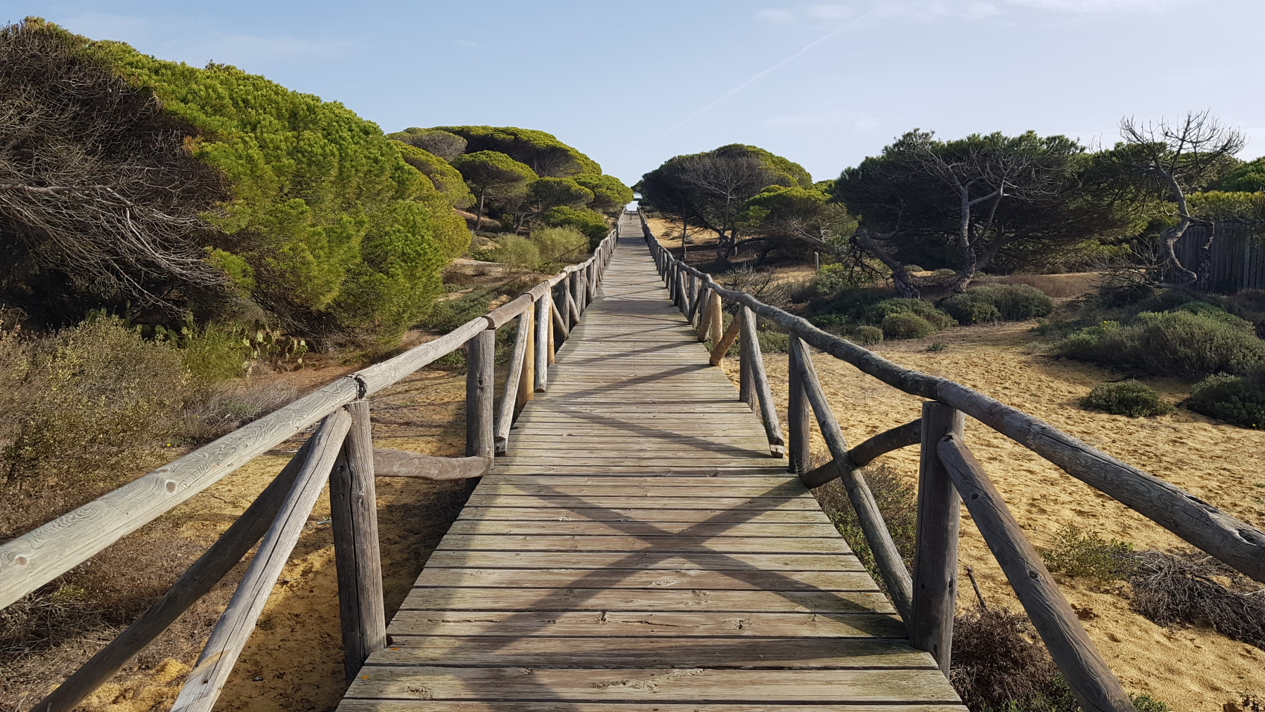 27 km weiter finden wir am nächsten Tag auf einer Klippe in Matalascanas eine sehr schöne Möglichkeit über das Wochenende zu bleiben. 4 Fahrzeug stehen in dem Sackgassenfeldweg. Der Ort ist fußläufig zu erreichen. Wir gehen heute in einem Lokal was Essen und sehen von zu Hause einen schönen Sonnenuntergang. Am Samstag machen wir noch eine kleine Wanderung in das mit Pinien durchsäte Dünengebiet.