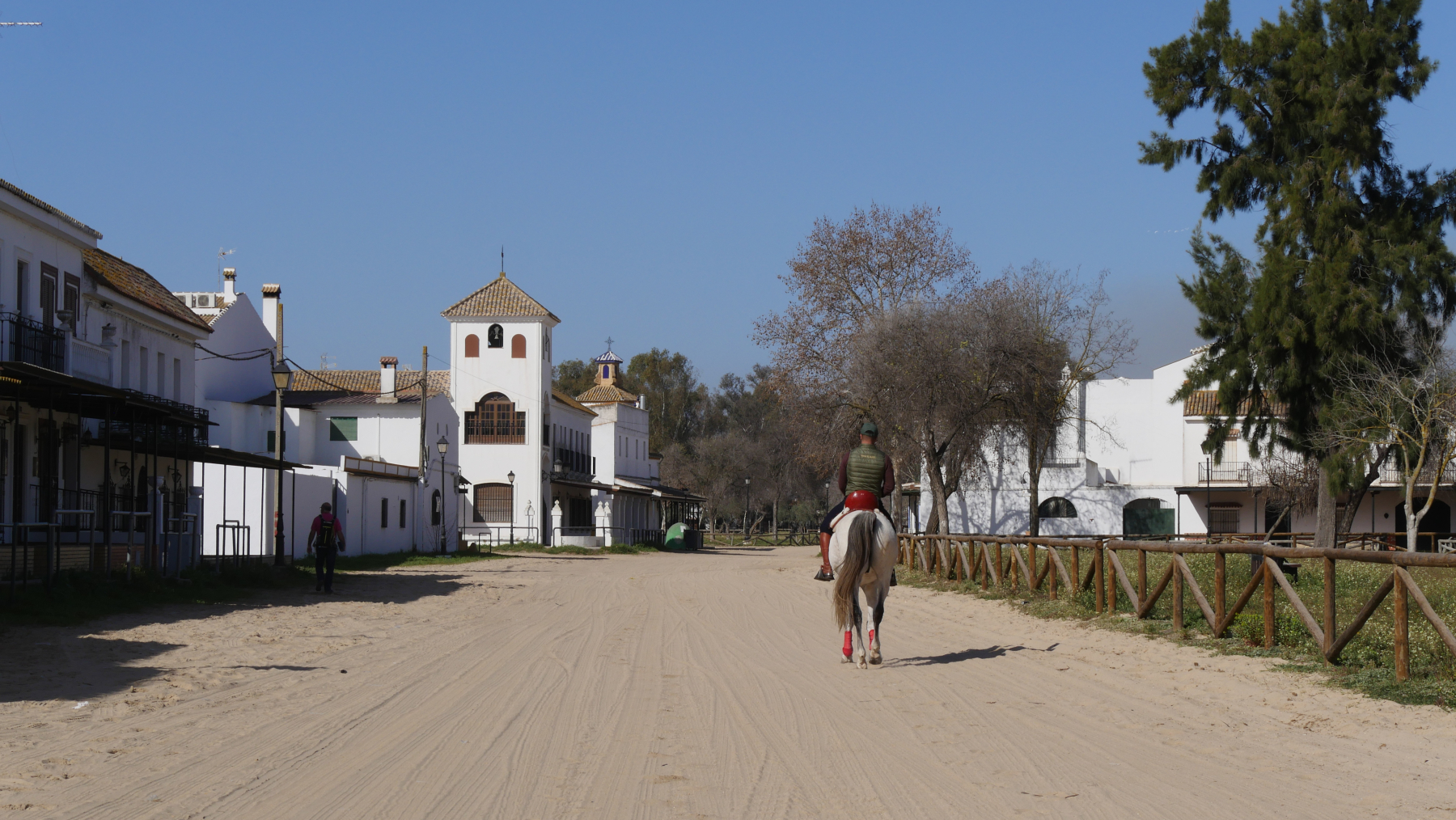 Nur 20 km ins Landesinnere liegt, noch im Donana Schutzgebiet, ein besonderer Ort: El Rocio. Ein Wallfahrtsort mit dem Gefühl des Wilden Westens. Im Ort gibt es keine „normalen“ Straßen – es gibt nur Sandpisten. Und ein wichtiges Verkehrsmittel ist das Pferd. Wallfahrtsort für bis zu 1 Million Menschen wird der kleine Ort Pfingsten zur „Romeria“, zu Ehren der Jungfrau von El Rocio.