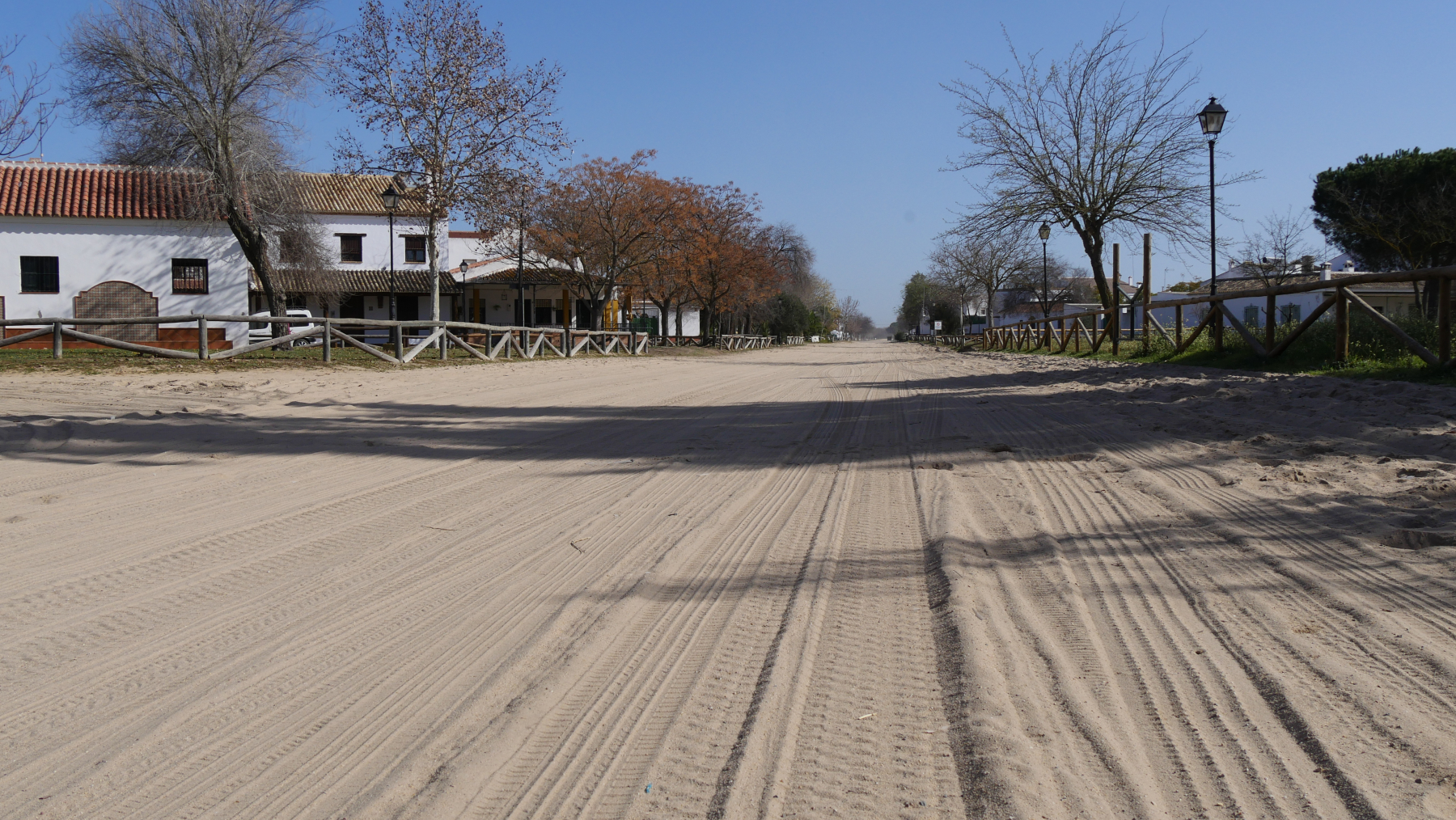 Nur 20 km ins Landesinnere liegt, noch im Donana Schutzgebiet, ein besonderer Ort: El Rocio. Ein Wallfahrtsort mit dem Gefühl des Wilden Westens. Im Ort gibt es keine „normalen“ Straßen – es gibt nur Sandpisten. Und ein wichtiges Verkehrsmittel ist das Pferd. Wallfahrtsort für bis zu 1 Million Menschen wird der kleine Ort Pfingsten zur „Romeria“, zu Ehren der Jungfrau von El Rocio.