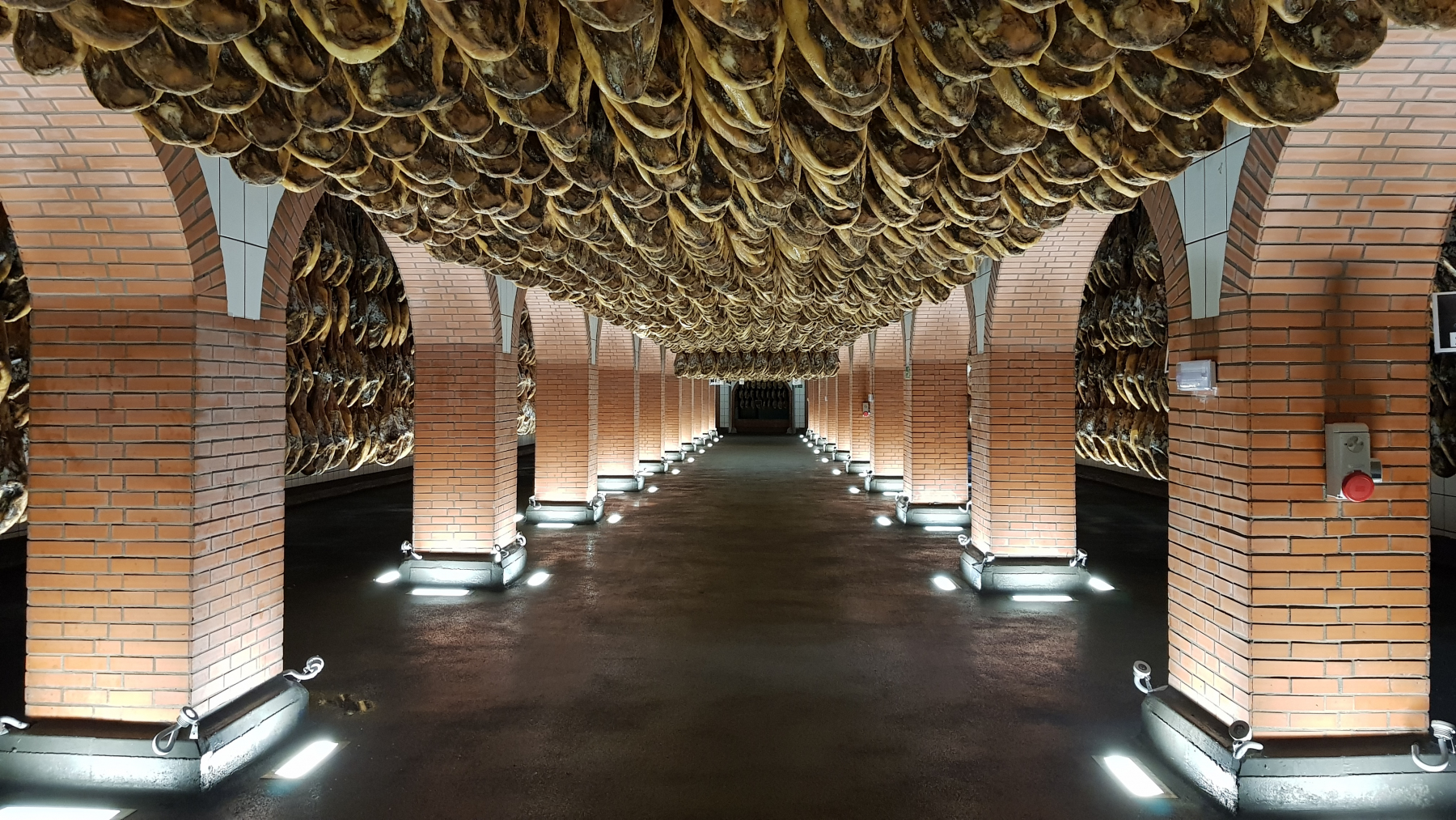 Naiv unterhalten wir uns bei normaler Lautstärke auf Deutsch darüber wie es zu dieser Preisfindung kommen kann. Plötzlich springt der Mann, der hinter seinem Laptop hinter der Tür saß, auf und sagte: „Ich höre sie kommen aus Deutschland?!“ Leicht beschämt kommen wir aber schnell in ein sehr nettes Gespräch. Er ist in Krefeld geboren, Mutter Deutsche, Vater Spanier, aufgewachsen in Sevilla und wohnt in Aracena – unser nächstes Ziel. Er gibt uns direkt einen Plan und zeigt uns Ziele, in der Umgebung. Top. Wären wir nicht hingefahren. Auch erklärt er uns die Preisunterschiede zu Mit-Wettbewerbern. Es fängt an mit den auf den Fotos zu sehender Verpackung (und sicherlich auch edlem Verkaufsschrank). Ohne dies sind es schon € 2 Euro /100g weniger. Den Rest erklärt er mit dem großen Aufwand alles aus einer Hand. Man muss wissen, dass Iberico Schinken gesetzlichen Regeln unterliegt, das heißt z.B. für den Bellota die Fütterung in den letzten beiden Monaten nur mit Eicheln. Natürlich bietet er uns eine Führung an – auf Deutsch. Kosten nur € 17,– p.P. mit Probe. Nur??!! Wir überlegen kurz, entscheiden uns aber schnell. In Spanien waren wir noch nie bei einer Besichtigung und jetzt sind wir nun mal hier. Wir sind es den Schweinen einfach schuldig.