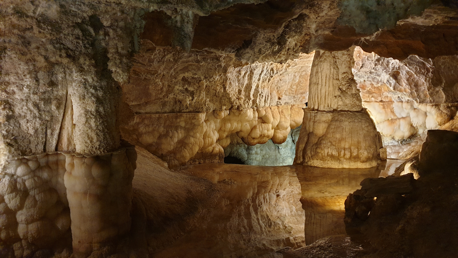 Aracena ist bekannt für seine Grotte. Im Internet steht was von Onlinebuchung, sonst kein Zugang. Was wir nicht mehr mögen, sind feste Termine. Was ist, wenn etwas dazwischenkommt oder wir einfach keine Lust haben. Also stehen wir um 11 Uhr, eine halbe Stunde vor Führungsbeginn am Eingang. Karten kein Problem, € 10,– p.P. Zwanzig Leute stehen schon da. Wir bekommen je ein Audiogerät für einen deutschen Guide. Super. Funktioniert einwandfrei.