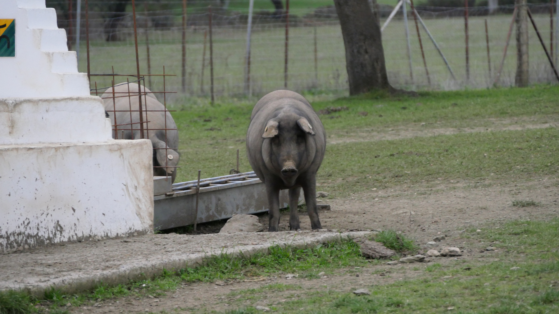 Naiv unterhalten wir uns bei normaler Lautstärke auf Deutsch darüber wie es zu dieser Preisfindung kommen kann. Plötzlich springt der Mann, der hinter seinem Laptop hinter der Tür saß, auf und sagte: „Ich höre sie kommen aus Deutschland?!“ Leicht beschämt kommen wir aber schnell in ein sehr nettes Gespräch. Er ist in Krefeld geboren, Mutter Deutsche, Vater Spanier, aufgewachsen in Sevilla und wohnt in Aracena – unser nächstes Ziel. Er gibt uns direkt einen Plan und zeigt uns Ziele, in der Umgebung. Top. Wären wir nicht hingefahren. Auch erklärt er uns die Preisunterschiede zu Mit-Wettbewerbern. Es fängt an mit den auf den Fotos zu sehender Verpackung (und sicherlich auch edlem Verkaufsschrank). Ohne dies sind es schon € 2 Euro /100g weniger. Den Rest erklärt er mit dem großen Aufwand alles aus einer Hand. Man muss wissen, dass Iberico Schinken gesetzlichen Regeln unterliegt, das heißt z.B. für den Bellota die Fütterung in den letzten beiden Monaten nur mit Eicheln. Natürlich bietet er uns eine Führung an – auf Deutsch. Kosten nur € 17,– p.P. mit Probe. Nur??!! Wir überlegen kurz, entscheiden uns aber schnell. In Spanien waren wir noch nie bei einer Besichtigung und jetzt sind wir nun mal hier. Wir sind es den Schweinen einfach schuldig.