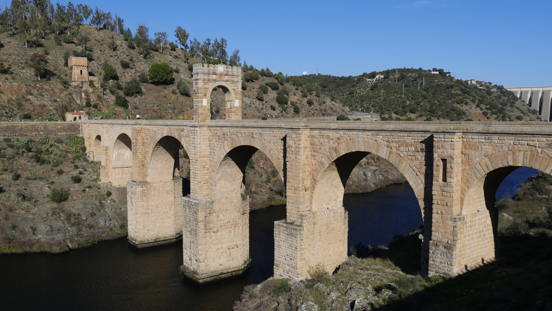Römisches Brückenbauwerk, 194m lang. Die 8m breite Fahrbahn liegt bei etwa 50m über dem Normalwasserspiegel des Tajo.