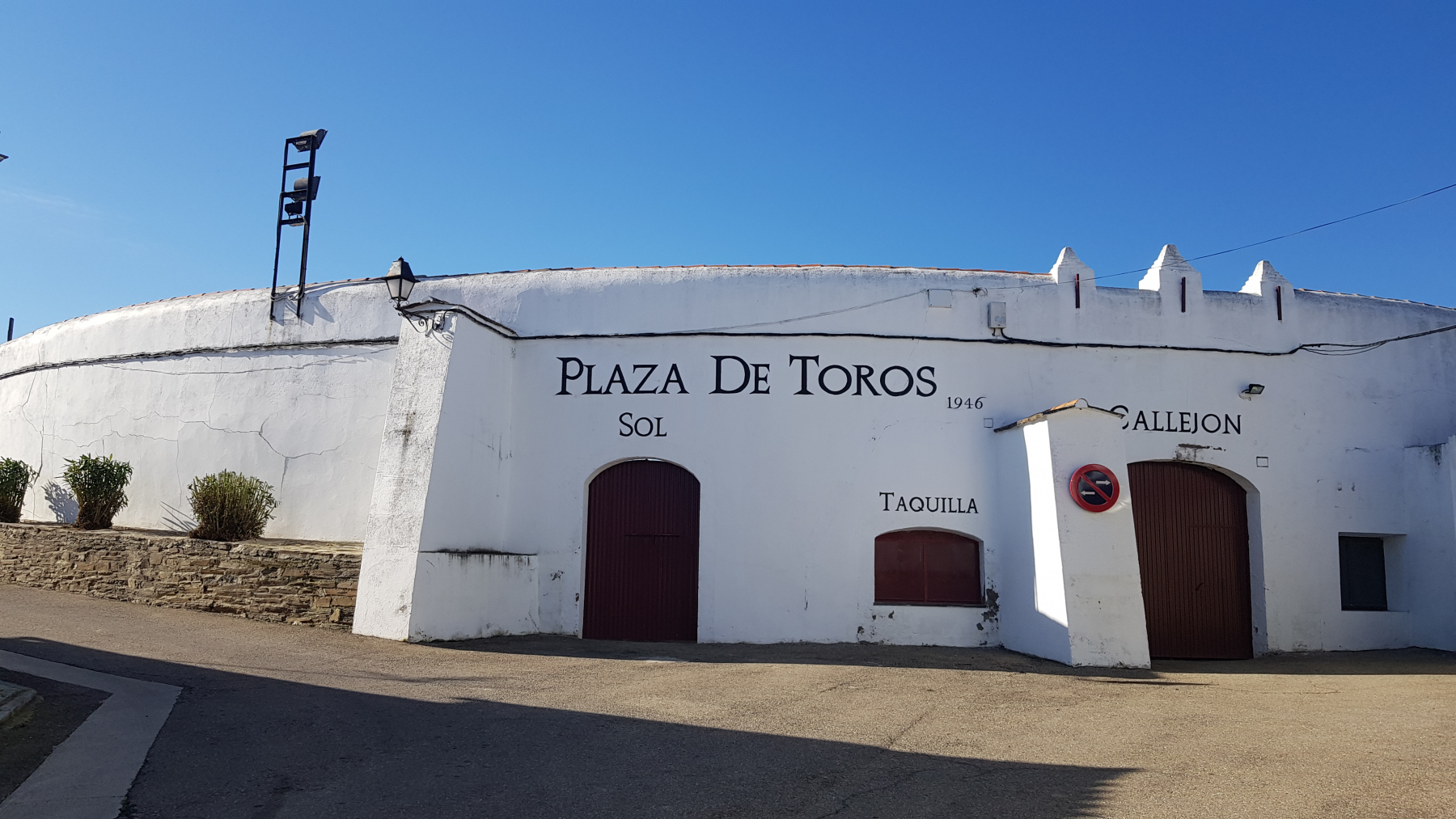 Unser aller letztes Ziel wird jetzt doch Fregenal de la Sierra, nur 22 km südlich. Bekannt ist der kleine Ort durch die Templerburg aus dem 13. Jahrhundert in die dann später eine Stierkampfarena gebaut worden ist. Und die kann man kostenlos besichtigen.