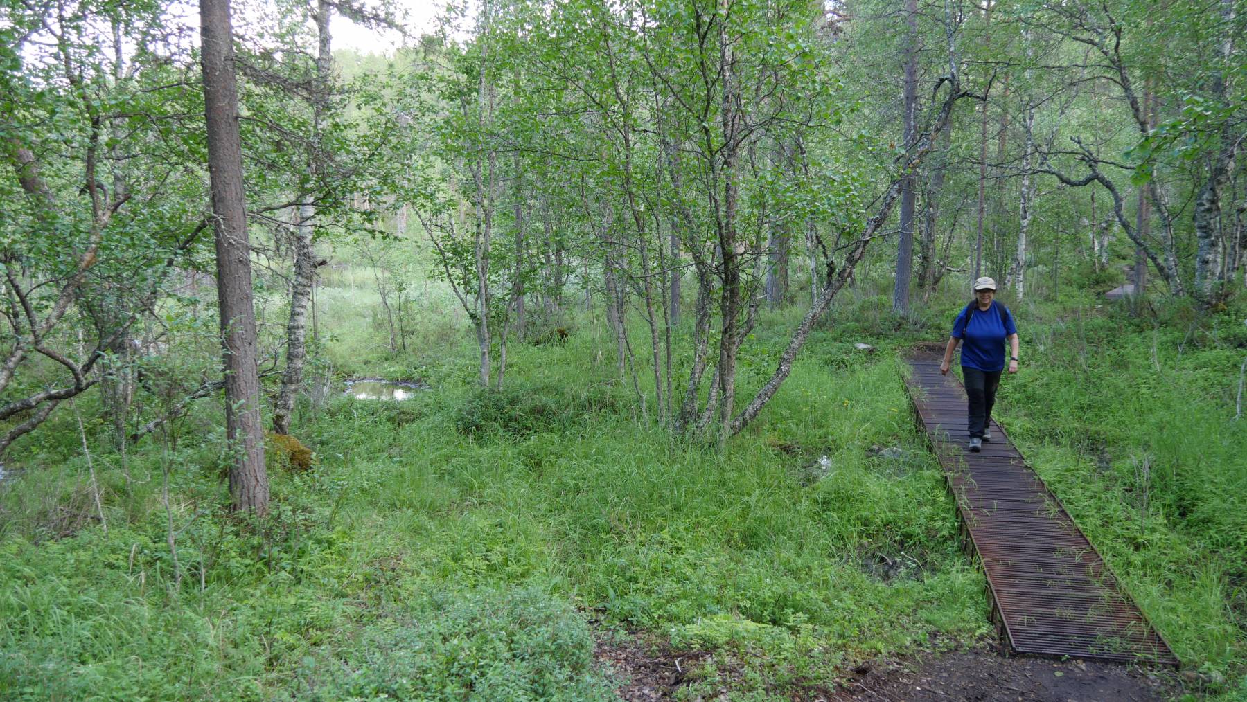 Dieser Nationalpark ist so groß wie das Saarland. Irgendwie haben wir den Ehrgeiz, doch noch mal in Lappland zu wandern. Auf dem Parkplatz stehen wieder viele PKW und auch zwei Wohnmobile. Erstaunlich ist, dass alle auch noch am kommenden Morgen dort stehen. Es sind fast ausnahmslos Einheimische, die offensichtlich Mehrtagestouren unternehmen, auch an den großen Rucksäcken und der perfekten Ausstattung zu erkennen. Wir nehmen uns zumindest einen kleinen 8km Trail vor. Intensives Einsprayen und ein Moskito-Gesichtsschutz sind Pflicht.