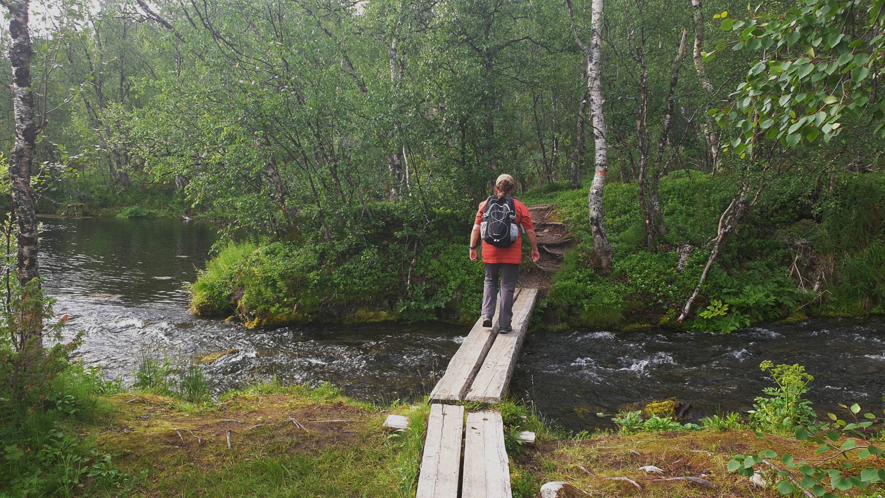Inari peilen wir als Zwischenstopp zum Tanken und einkaufen an. Inari – ein See mit 4 Buchstaben – wer kennt ihn nicht. Der Ort ist absoluter Drehpunkt der Nordlandfahrer, sieht man spätestens an den verschiedensten Wohn-fahrzeugen und Nationalitäten. Uns ist es hier zu voll und wir haben hier auch keine Aktivitäten vor. Wir wollen jetzt am norwegisch/finnischen Grenzfluss Tana/Karasjohka entlang nach Norwegen. Ein kleiner Spaziergang im Nationalpark Kevon-Iuonnonpuisto steht aber aber vorher noch an. Es sind nur 2 km, zwar mit viel auf und ab, aber die Hügel sind mit vielen Treppen gut zu überwinden. Und warum haben wir über 4 Stunden gebraucht? Auf halber Strecke haben wir uns total verquatscht. Eine supernette junge Frau, die mit Ihrem ganzen Stolz – einem schicken Kastenwagen – unterwegs ist. 4.000km bereits durch Norwegen hinter sich und Schweden nun vor sich. Nicht nur das sie Top-Organisiert ist, hat sie bereits mehrere sehr herausfordernde Wanderungen in Norwegen bewältigt. Unsere Hochachtung für den Mut dies alleine zu tun. Toll, deine positive Energie. Liebe Coelestina, eine gute Weiterreise, viele Eindrücke und Alles Gute für Deine Vorhaben!