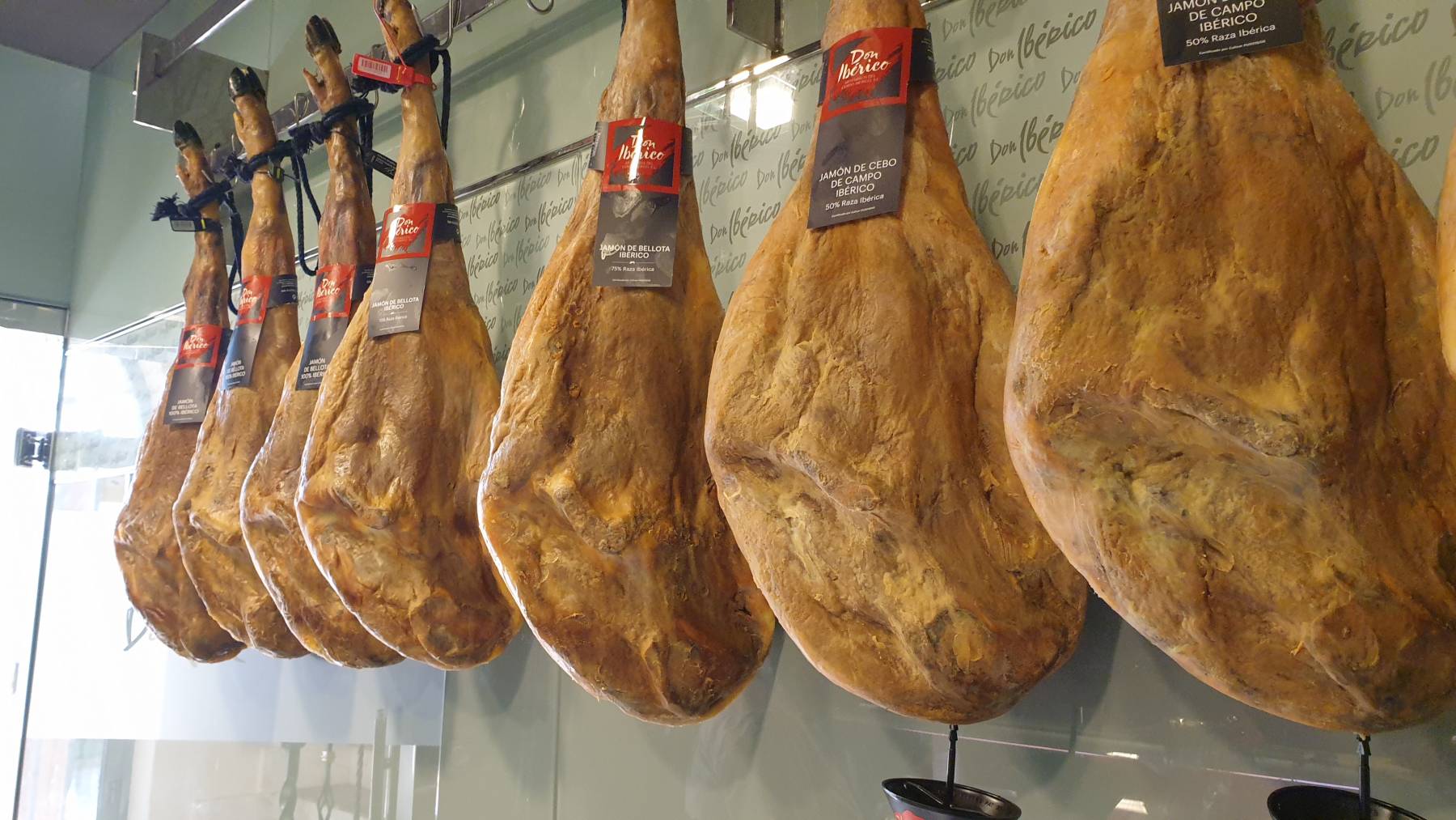 Wir wollen nicht unerwähnt lassen, dass wir zuvor noch eingekauft haben: Schinken aus Guijuelo, eines der „Schinkenhauptstädte“.  5 Schinkenmanufakturen beglücken wir mit unserem Besuch und decken uns mit dem teuersten und anerkannterweise weltbestem Schinken ein. Schinken vom dunklen Iberico Schwein, welches beim Iberico Bellota nur mit Früchten der Steineiche (Eicheln) und Kräutern gefüttert wird. Preis ab € 11/100g, auch mal schnell bis zu € 30, kommt auf den Hersteller an. Wir kaufen auch Paleta (vom Vorderbein) oder Cebo mit Zufütterung. Die kosten auch nur rund die Hälfte, schmecken halt auch nicht so göttlich.
