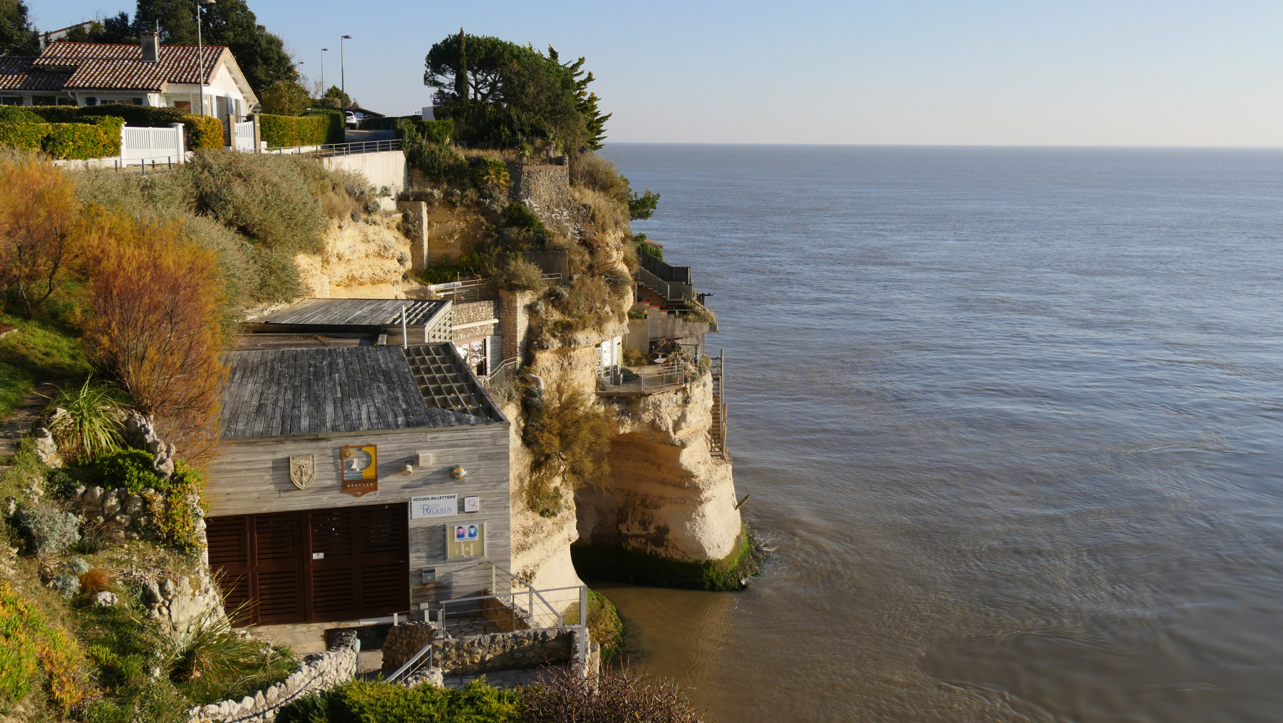 Es gibt so viele Sachen – so unterschiedlicher Art – zu sehen. Meschers sur gironde ist wieder so ein besonderer Ort. Hier warten die in die Klippen (falaises) hineingetriebenen Höhlen auf uns. Sie dienten als Fischerhütten, als Getreidespeicher, als Verstecke der Protestanten oder im 19. Jahrhundert als einfache Kneipen. Leider ist alles zu und wir können keine von innen besichtigen. Fotogen sind sie aber so schon. Wir finden einen kleinen Abgang runter zum Wasser. Toll. Wir gehen direkt an den Fischerhütten (Carrellets) vorbei. Sorry, aber einfach fotogen.