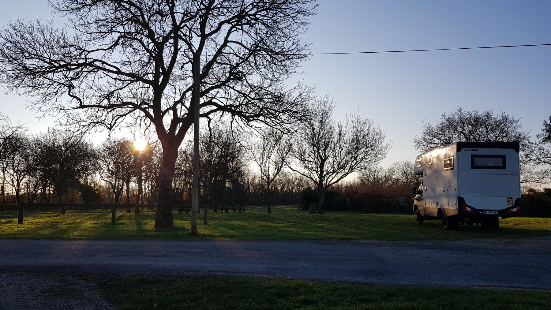 Wir fahren wieder an die Küste und haben schon wieder 17 Uhr. Im Winter wird es nun mal früher dunkel und an sich wollen wir um diese Zeit schon irgendwo wieder stehen. Ein paar kleinere Plätze schlägt uns der Womo-Führer vor. Aber Anette entdeckt rechts ein Schild zu einem offiziellen Stellplatz. Super gelegen am Kanal und fast alleine stellen wir uns Richtung Sonnenuntergang