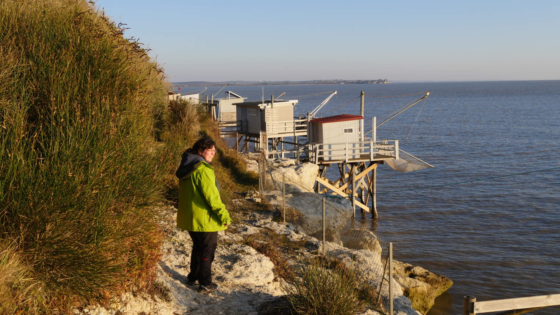 Es gibt so viele Sachen – so unterschiedlicher Art – zu sehen. Meschers sur gironde ist wieder so ein besonderer Ort. Hier warten die in die Klippen (falaises) hineingetriebenen Höhlen auf uns. Sie dienten als Fischerhütten, als Getreidespeicher, als Verstecke der Protestanten oder im 19. Jahrhundert als einfache Kneipen. Leider ist alles zu und wir können keine von innen besichtigen. Fotogen sind sie aber so schon. Wir finden einen kleinen Abgang runter zum Wasser. Toll. Wir gehen direkt an den Fischerhütten (Carrellets) vorbei. Sorry, aber einfach fotogen.