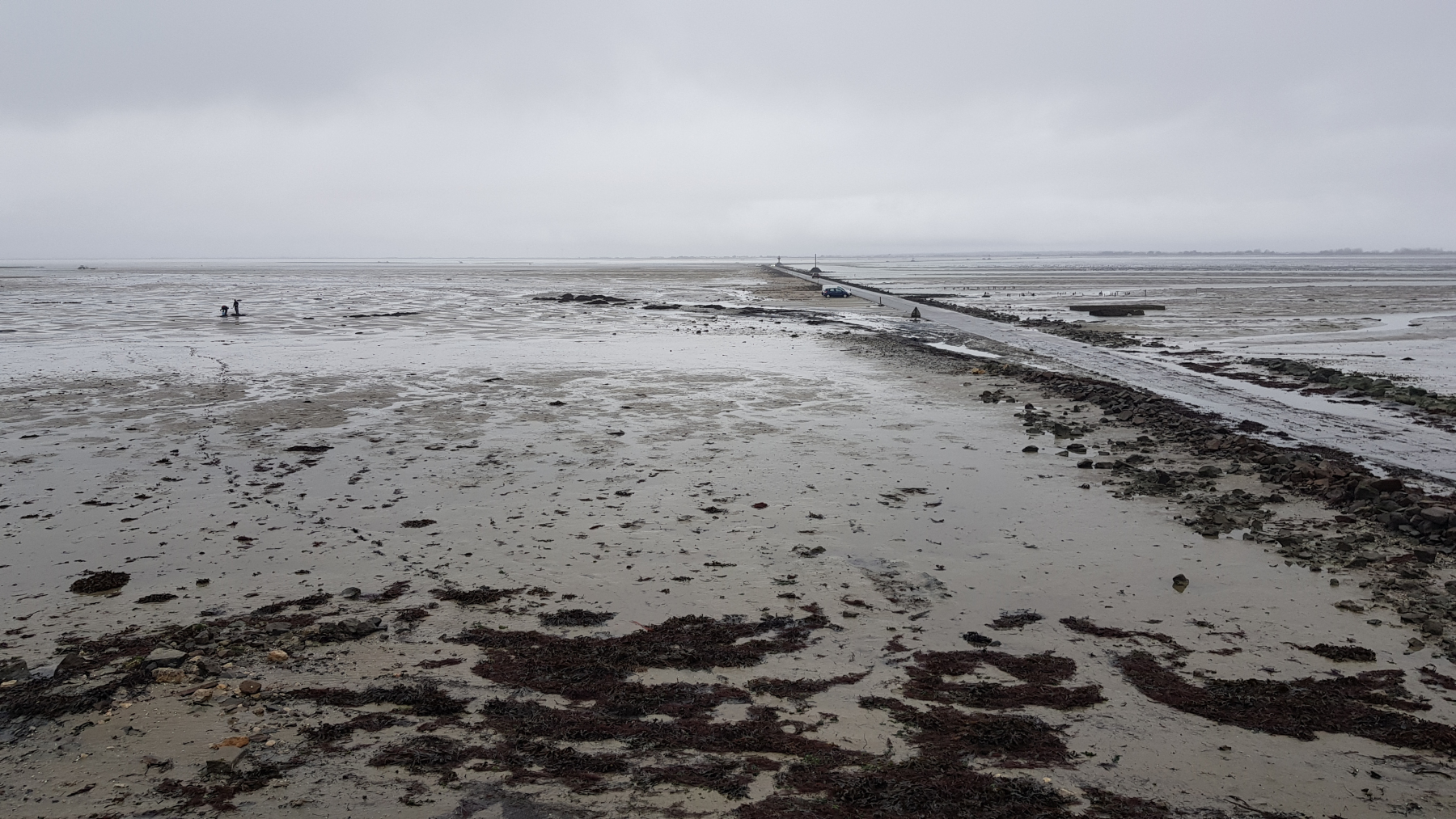 Vor dem nächsten etwas kuriosen Highlight wird uns schon etwas mulmig. In unserem Womoführer steht, dass die sich das nicht getraut haben: Die Durchquerung des Atlantiks zur Insel Noirmoutier-en-l´Ile. Gut nur auf einer Strecke von 3 km. Durch die Gezeiten wird die Strecke für einige Stunden befahrbar. Das wird sehr groß angezeigt, sogar mehrsprachig. Ein echtes Abenteuer ist es vielleicht nicht, aber mit dem neuen Fahrzeug durch das Watt zu fahren hat was – auch wenn es tatsächlich eine betonierte Piste ist.
