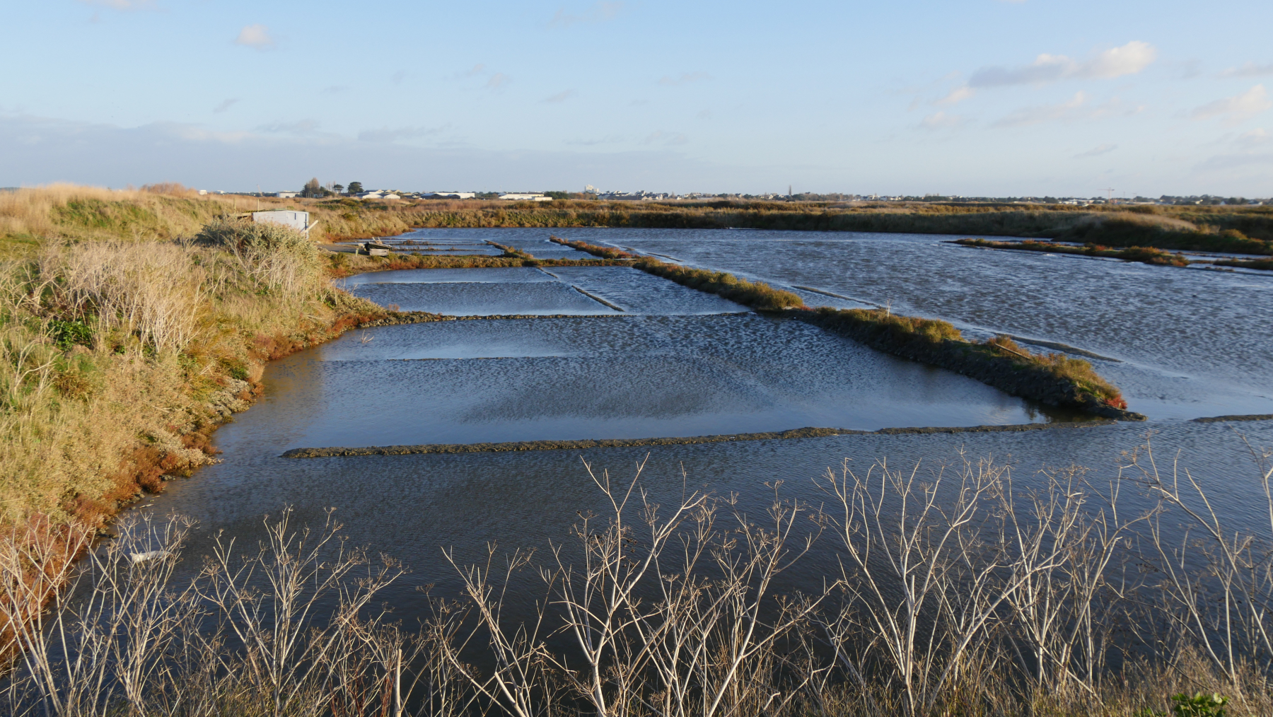 Pünktlich um 10 Uhr kommt unsere Führerin zum verabredeten Treffpunkt am Zentrum von Terre de Sel. Wir sind zu fünft: Sie bringt noch zwei PraktikantInnen mit. Ist halt Winter. Sehr schön und sie bringen uns sehr nett das Ernten des Salzes näher.
