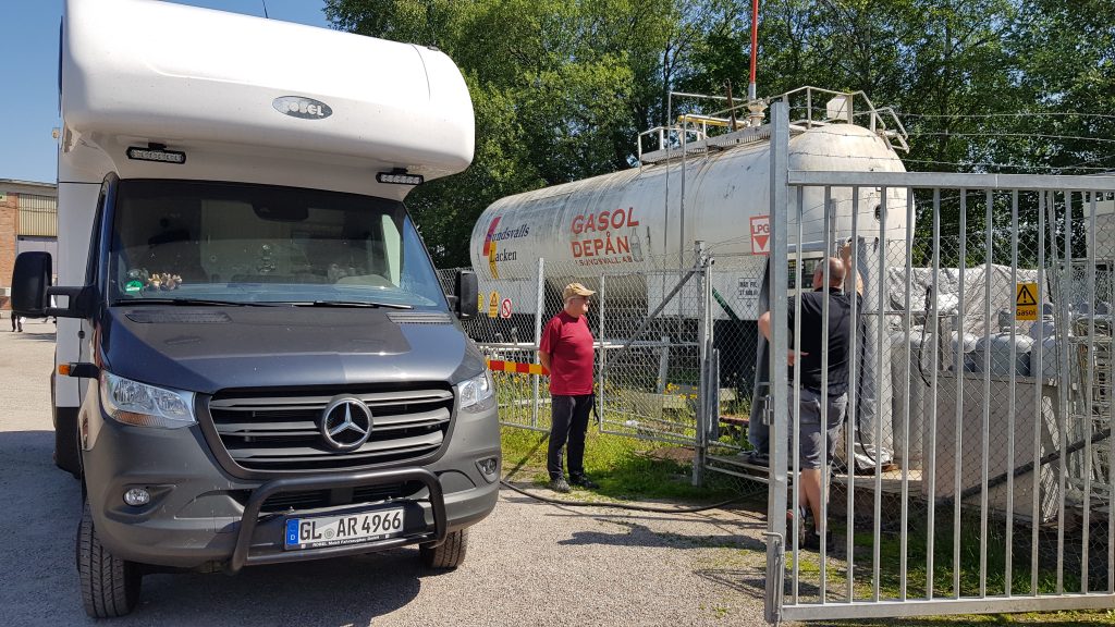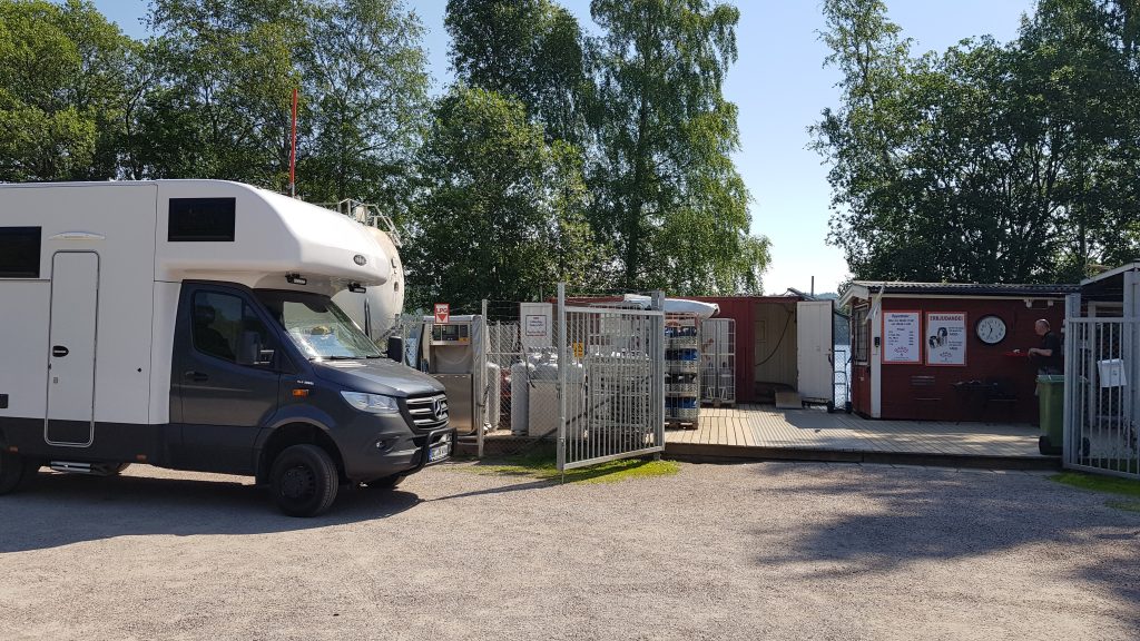 Nach mehreren Tagen „Stillstand“ kommen wiederkehrende Pflichtaufgaben auf uns zu : Ver- und entsorgen etc.. Das bedeutet direkt am Stellplatz Müll entsorgen, ein paar Kilometer weiter zur Mülltrennungsanlage für Papier-, Plastik-, Glas- und Metallmüll. Weiter zum Tanken für die im Moment üblichen € 2,50/Liter Diesel. Da sehen wir auch noch eine AdBlue Zapfstelle für rund € 1,–/Liter. Der Sprinter verbraucht nur 0,23l/100 km und wir hätten noch ein paar Tausend Kilometer fahren können, aber wir wollten mal nachtanken, bevor es eventuell im hohen Norden nicht mehr geht.