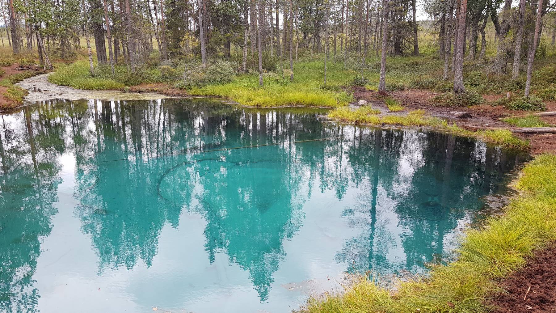 Natur, Natur. Einen Abstecher zur Froschquelle. Sie ist eine ungewöhnlich große kalte Quelle und eine sogenannte artesische oder kochende Quelle, bei der das Wasser einen sehr hohen Druck hat. Das Auffälligste an der Quelle ist jedoch die eigentümliche türkise Farbe, die sich stark vom umgebenden Moor abhebt.