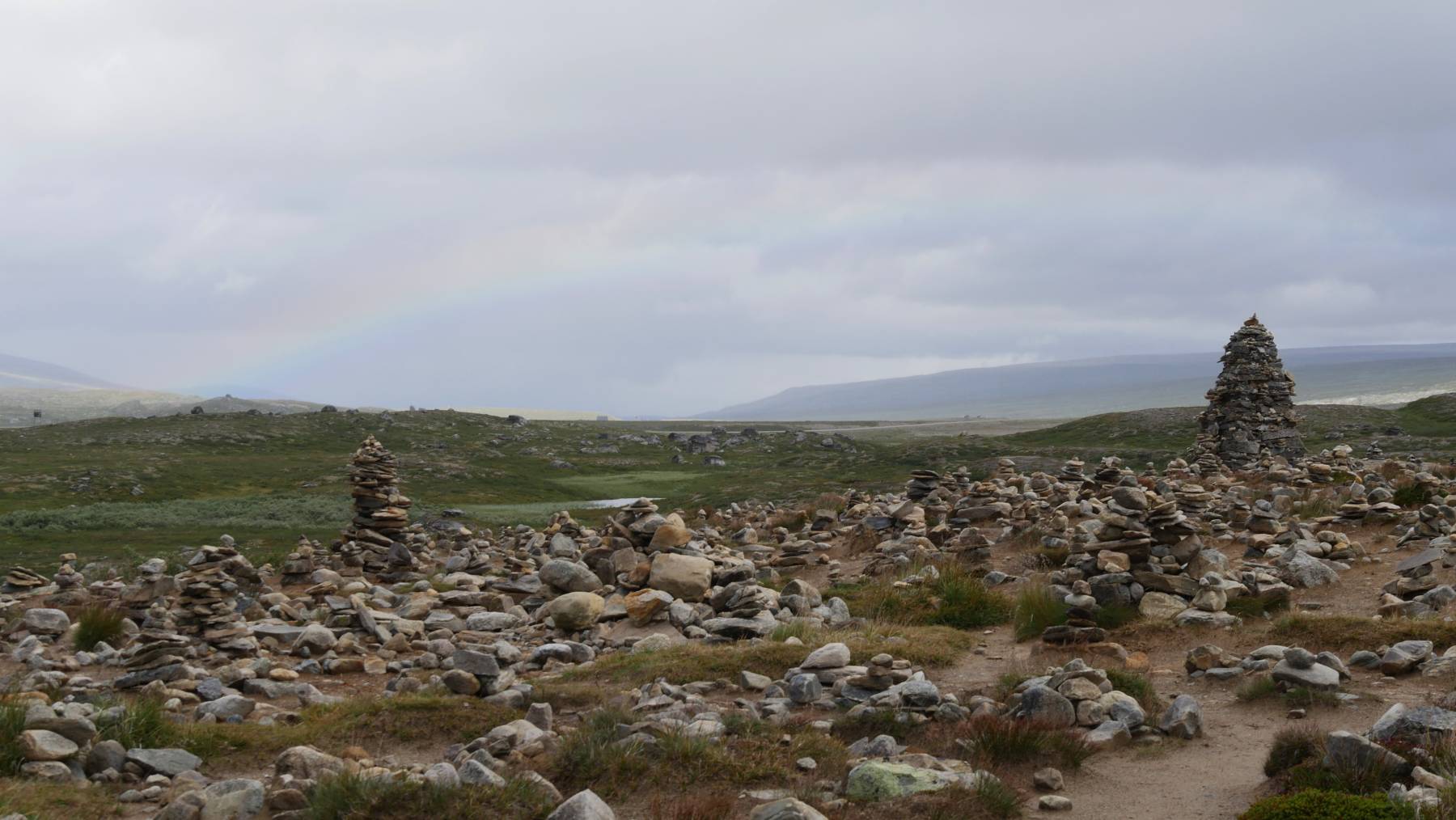 Viele haben ein Steinhäufchen geschichtet, im Hintergrund kann man, wenn man genau hinschaut, einen Regenbogen sehen