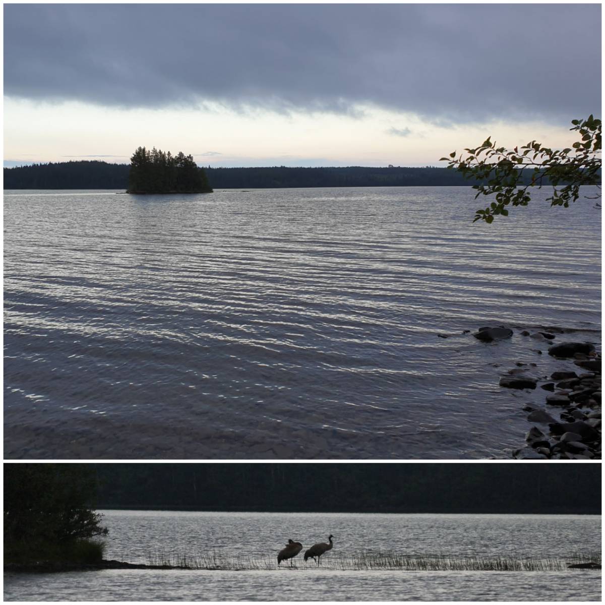 mit schönem Blick, hinten neben der Insel stehen 2 Kraniche