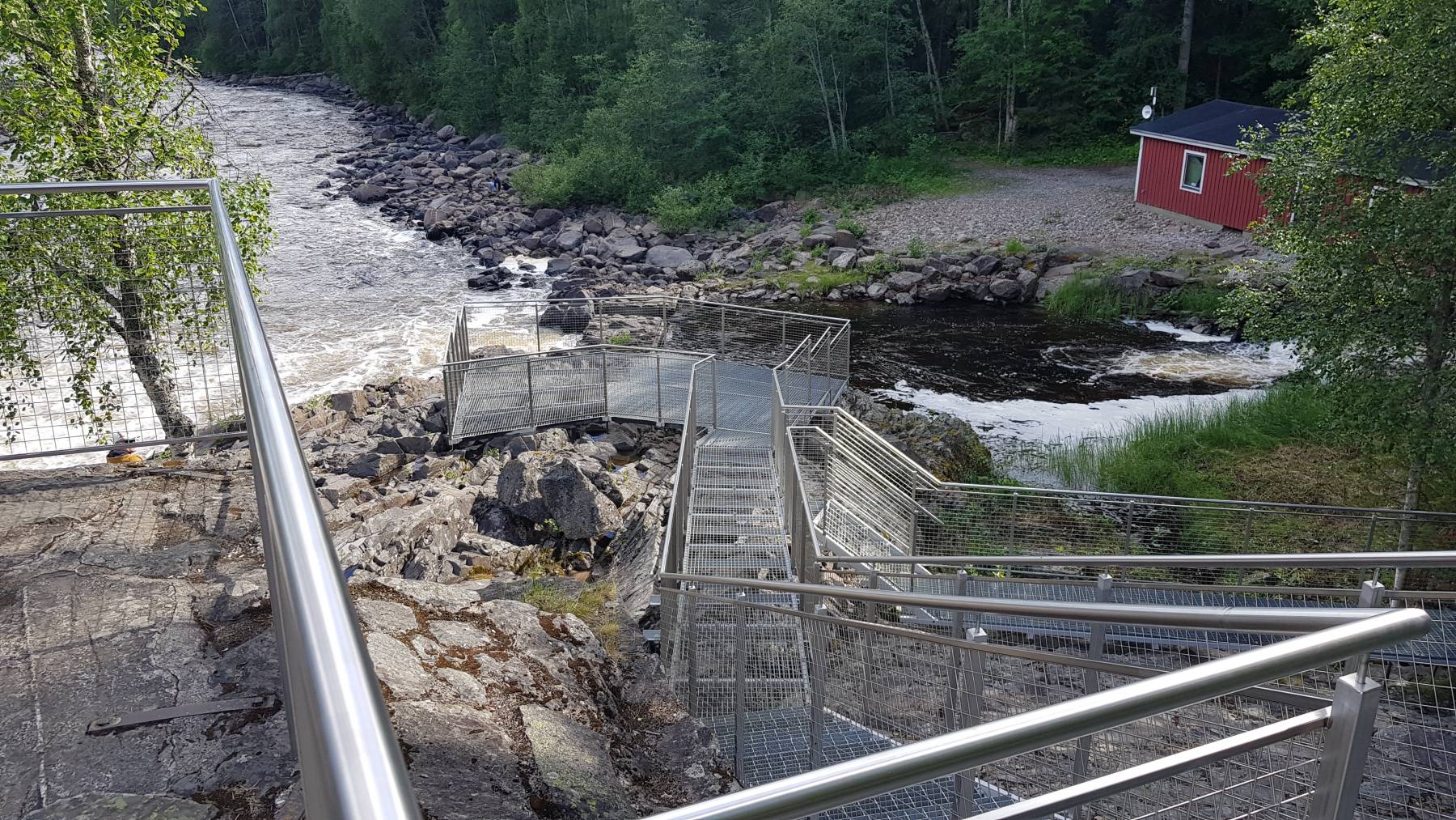 Man könnte meinen, dass wäre im Aquarium – halt hinter der Scheibe – ist aber in der Natur. Die Lachstreppen werden künstlich angelegt, damit die Lachse zu ihren Laichplätzen gelangen. Im Mai beginnen sie ihre Reise gegen den Strom zu ihren Geburtsorten, um selbst zu laichen. Bislang haben wir auf verschiedenen Lachstreppen in Norwegen, Schweden oder auch Neufundland noch keinen Lachs gesehen – unsere Premiere.