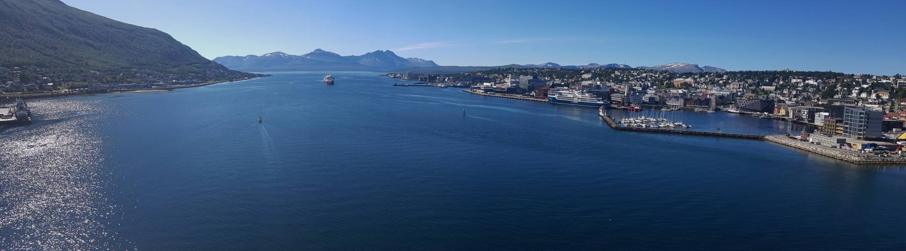 Wir erreichen Tromsø bei schönstem Sonnenschein und wollen zuerst mit der Seilbahn auf den Hausberg. So kann man die schöne Lage von Tromsø mit der Eismeerkathedrale am besten wahrnehmen. € 32 pro Person 😱. Das ist uns allen vieren zu teuer. Man könnte zu Fuss hoch, 418 m sind uns aber zu hoch. Da packt Fabian seine Drohne aus und wir erhalten noch schönere, individuelle Ausblicke. (siehe Video von Jessica am Ende dieses Beitrages)