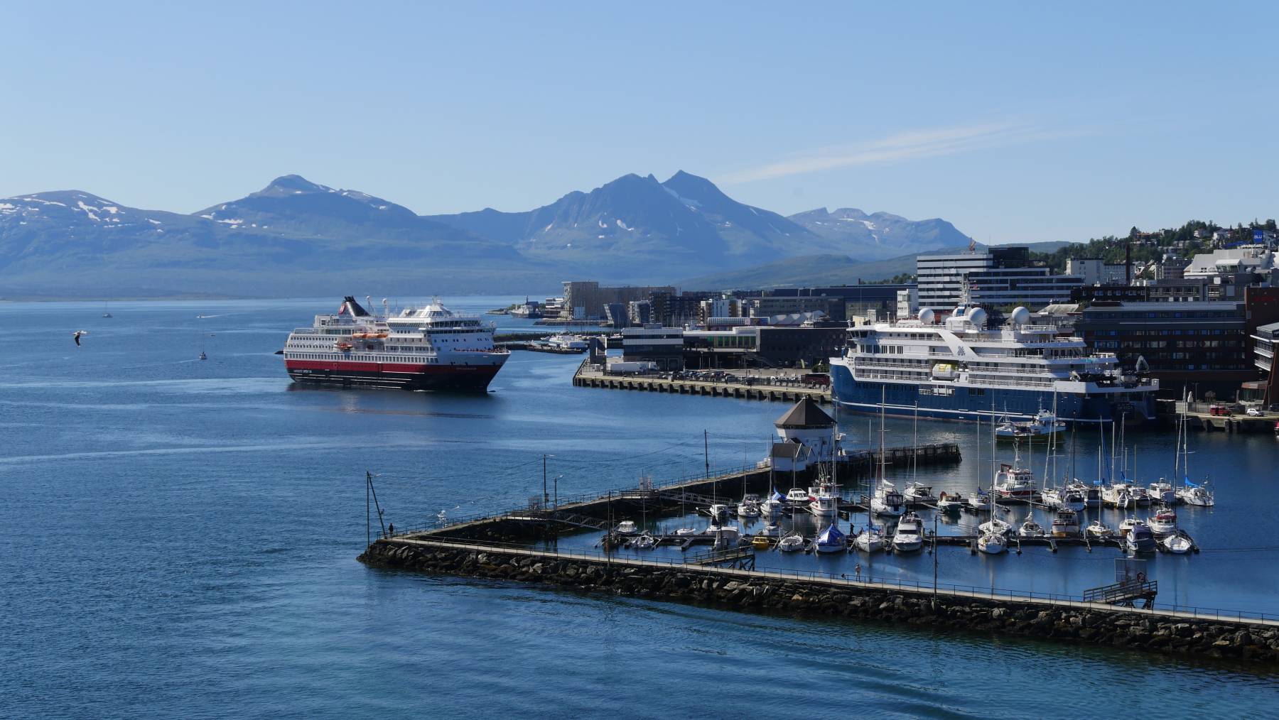 Es kommt gerade ein Hurtigrutenschiff in den Hafen