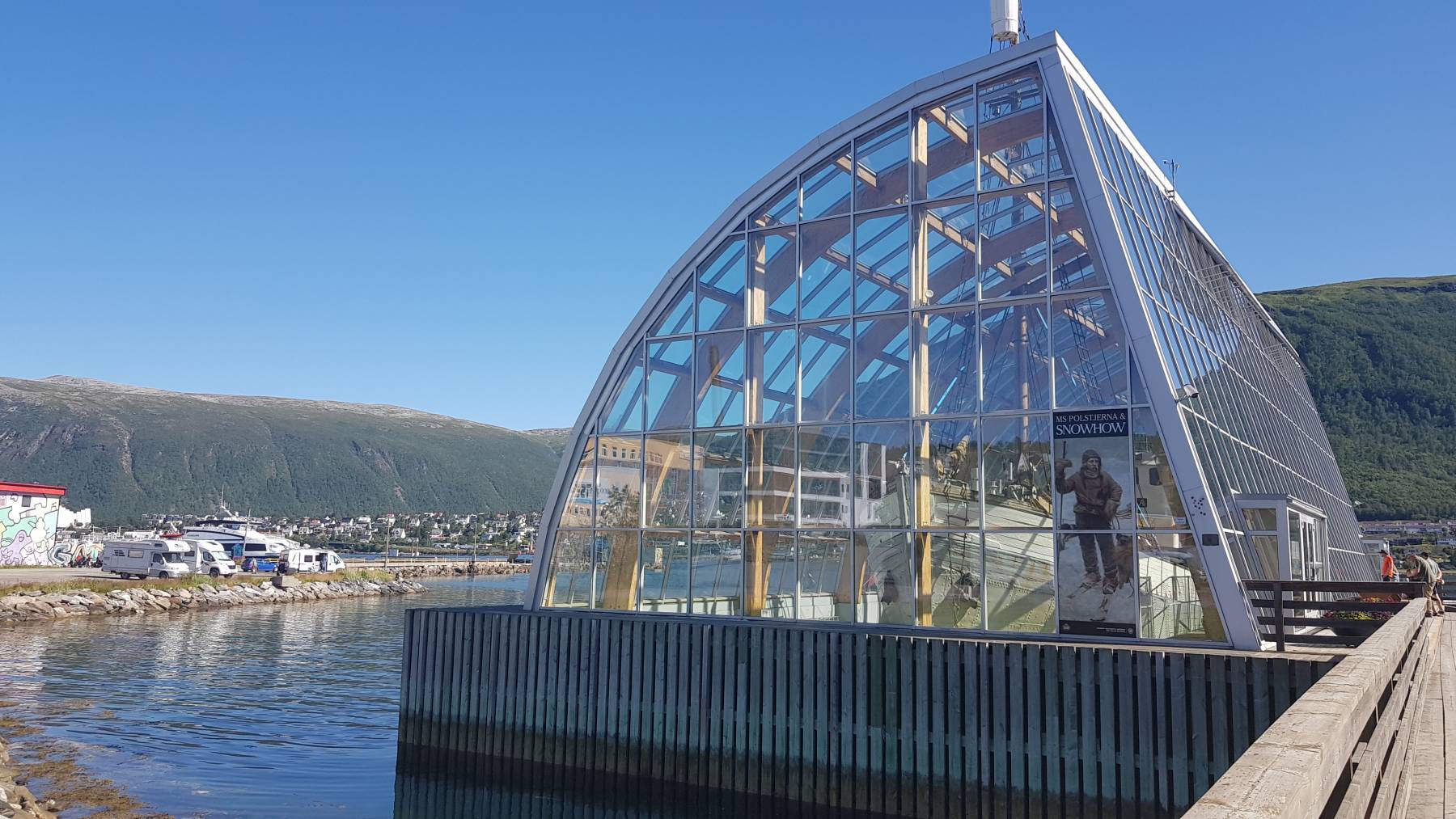 Wir erreichen Tromsø bei schönstem Sonnenschein und wollen zuerst mit der Seilbahn auf den Hausberg. So kann man die schöne Lage von Tromsø mit der Eismeerkathedrale am besten wahrnehmen. € 32 pro Person 😱. Das ist uns allen vieren zu teuer. Man könnte zu Fuss hoch, 418 m sind uns aber zu hoch. Da packt Fabian seine Drohne aus und wir erhalten noch schönere, individuelle Ausblicke. (siehe Video von Jessica am Ende dieses Beitrages)