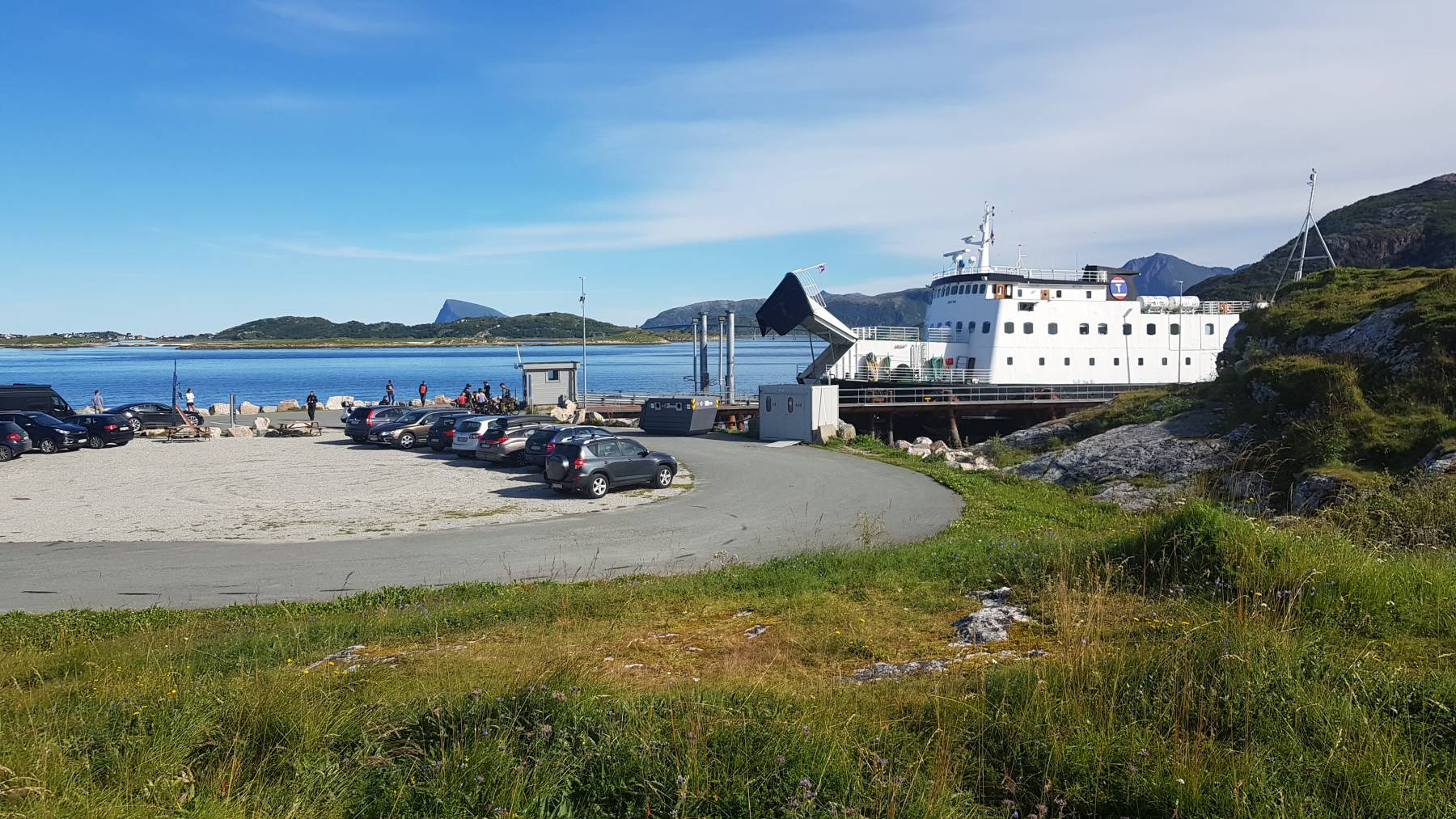 Husøy ist der erste Ort auf der Insel, der uns direkt positiv überrascht. Es gibt sogar einen Stellplatz unten im Hafen, für € 20/Nacht. Für einen einfachen Parkplatz finden wir das zu teuer und finden einen etwas seltsamen Platz für die Nacht, allerdings mit grandioser Aussicht. Wir stehen am Straßenrand, einer nicht stark befahrenen Straße, unmittelbar vor der Einfahrt zum Tunnel. Am kommenden Tag gehen wir 20 km entfernt, auf den Hesten mit Blick auf den Berg Segla. Eine sehr anstrengende Wanderung mit 430 Höhenmetern mit grandiosem Ausblick auf den Berg Segla und die Fjorde der Insel. Der Platz am Tunnel hat uns so gut gefallen, dass wir wieder zurück sind. Dieses Mal steigern wir unser „Camping am Tunnel“ und grillen alles was wir so haben. Die vorbeifahrenden Einheimischen grüßen nett.