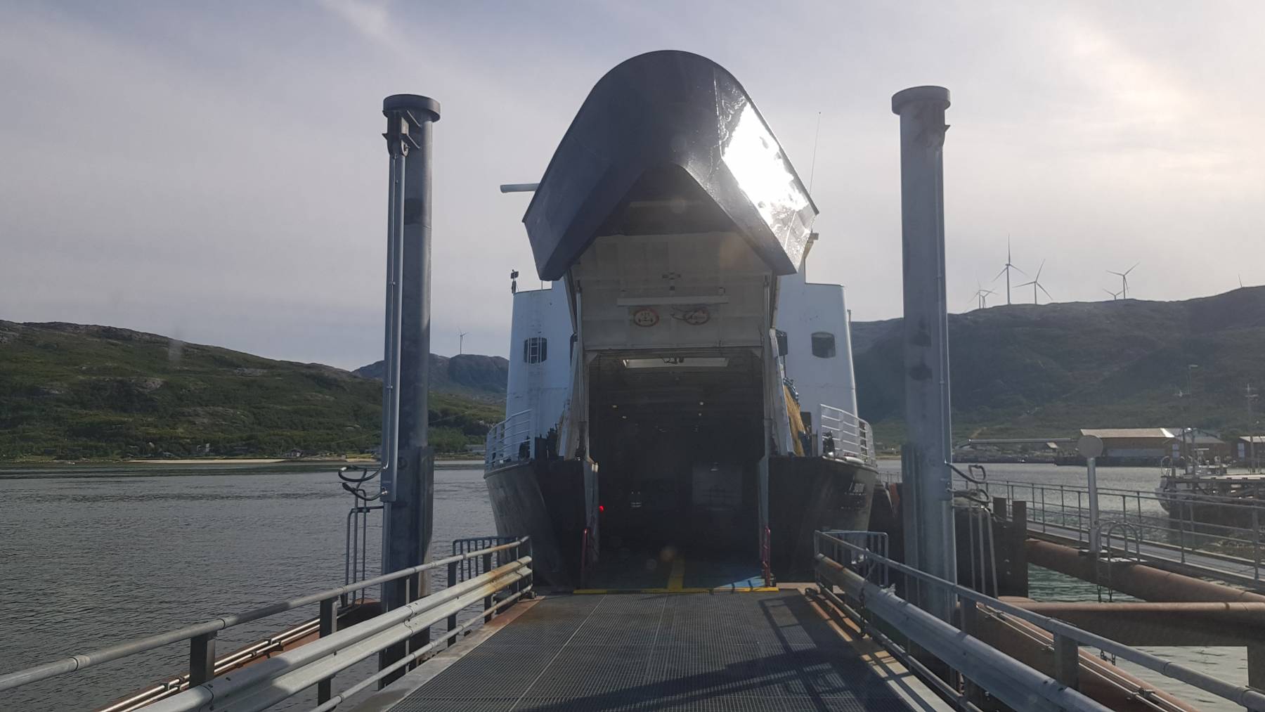 Am nächsten Morgen müssen wir früh raus. Die Fähre geht zwar erst um 10.15 Uhr, aber man soll früher da sein, da diese nur 25 Fahrzeuge aufnehmen kann. Die nächste Fähre geht 2 Stunden und dann wieder 5 Stunden später. Buchen ist nicht möglich. Vor uns stehen bereits 13 Wohnmobile und PKW, als wir um kurz nach 9 Uhr ankommen. Zu unserer großen Verwunderung zahlen wir das Gleiche wie Jessica und Fabian mit ihrem PKW, rund € 25,–. Beschrieben war es für das Doppelte. Glück gehabt.
