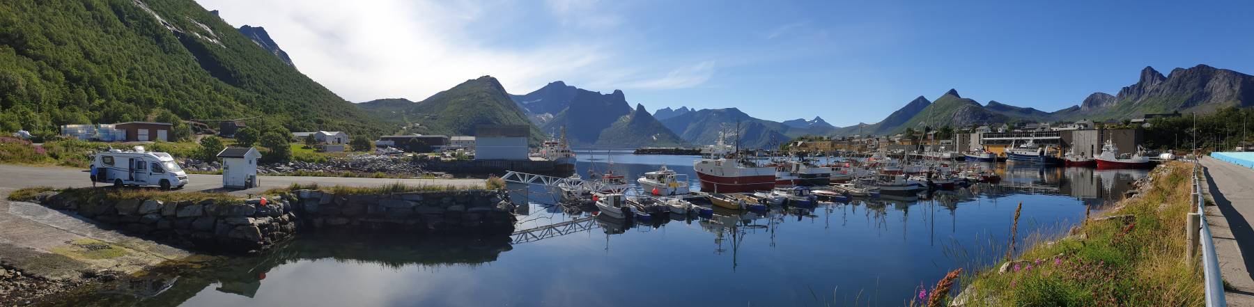 Husøy ist der erste Ort auf der Insel, der uns direkt positiv überrascht. Es gibt sogar einen Stellplatz unten im Hafen, für € 20/Nacht. Für einen einfachen Parkplatz finden wir das zu teuer und finden einen etwas seltsamen Platz für die Nacht, allerdings mit grandioser Aussicht. Wir stehen am Straßenrand, einer nicht stark befahrenen Straße, unmittelbar vor der Einfahrt zum Tunnel. Am kommenden Tag gehen wir 20 km entfernt, auf den Hesten mit Blick auf den Berg Segla. Eine sehr anstrengende Wanderung mit 430 Höhenmetern mit grandiosem Ausblick auf den Berg Segla und die Fjorde der Insel. Der Platz am Tunnel hat uns so gut gefallen, dass wir wieder zurück sind. Dieses Mal steigern wir unser „Camping am Tunnel“ und grillen alles was wir so haben. Die vorbeifahrenden Einheimischen grüßen nett.