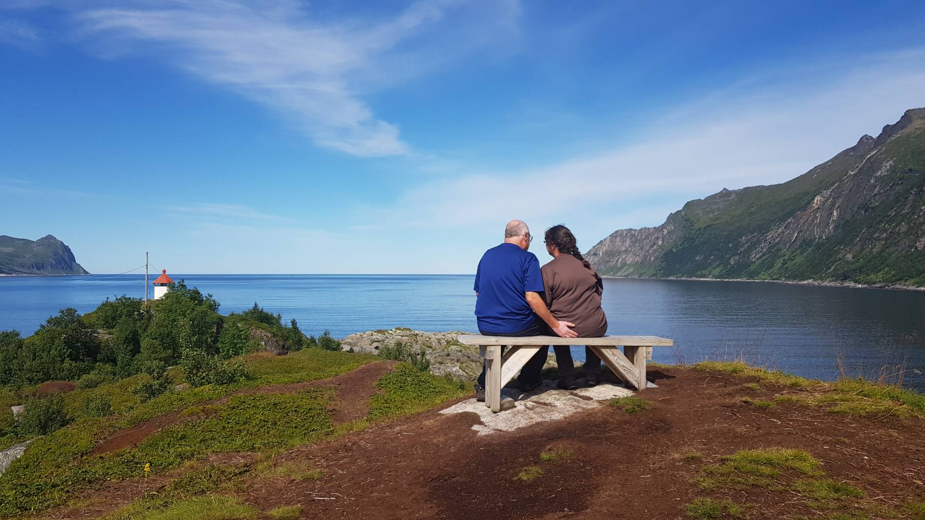Husøy ist der erste Ort auf der Insel, der uns direkt positiv überrascht. Es gibt sogar einen Stellplatz unten im Hafen, für € 20/Nacht. Für einen einfachen Parkplatz finden wir das zu teuer und finden einen etwas seltsamen Platz für die Nacht, allerdings mit grandioser Aussicht. Wir stehen am Straßenrand, einer nicht stark befahrenen Straße, unmittelbar vor der Einfahrt zum Tunnel. Am kommenden Tag gehen wir 20 km entfernt, auf den Hesten mit Blick auf den Berg Segla. Eine sehr anstrengende Wanderung mit 430 Höhenmetern mit grandiosem Ausblick auf den Berg Segla und die Fjorde der Insel. Der Platz am Tunnel hat uns so gut gefallen, dass wir wieder zurück sind. Dieses Mal steigern wir unser „Camping am Tunnel“ und grillen alles was wir so haben. Die vorbeifahrenden Einheimischen grüßen nett.