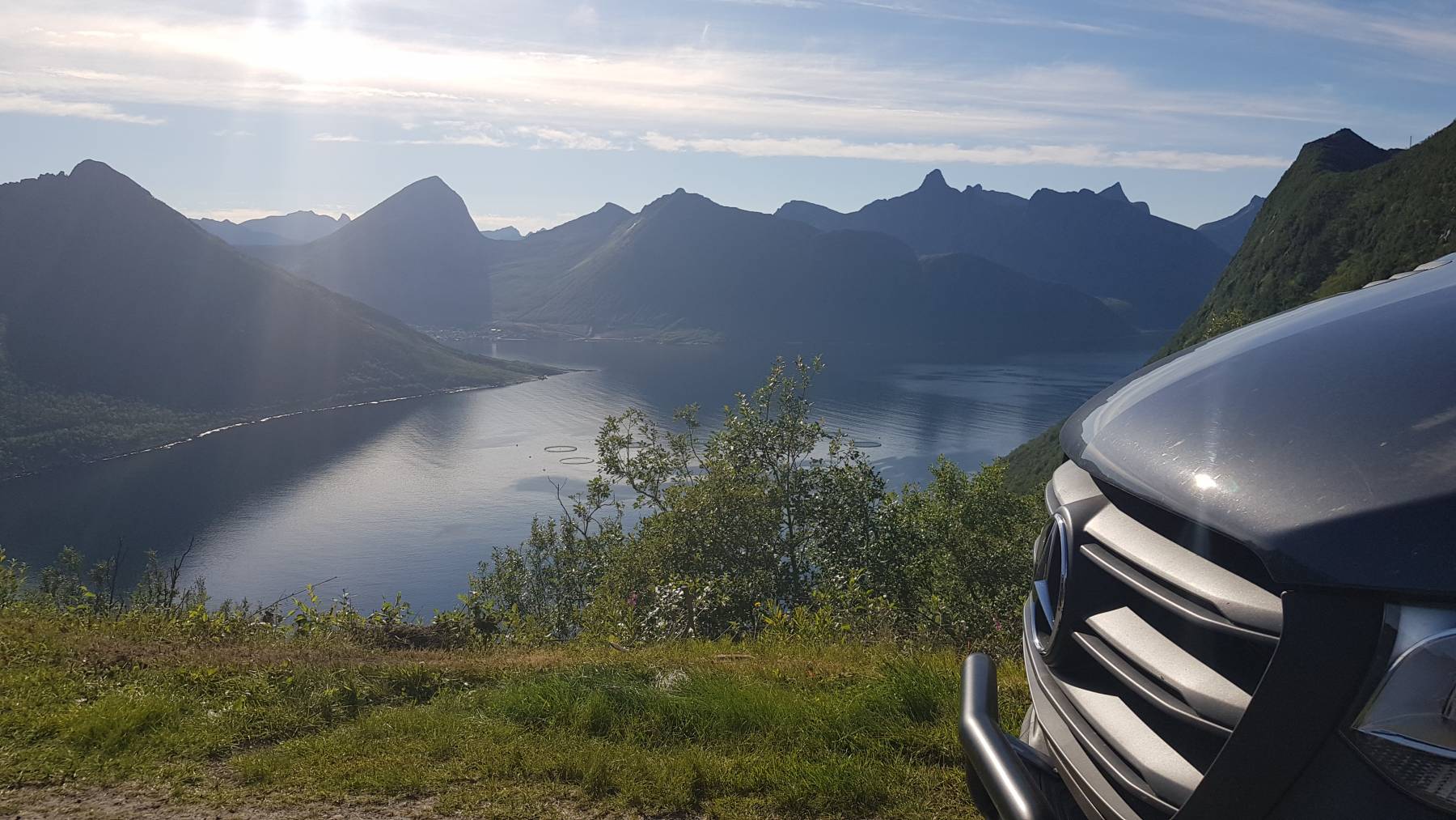 Husøy ist der erste Ort auf der Insel, der uns direkt positiv überrascht. Es gibt sogar einen Stellplatz unten im Hafen, für € 20/Nacht. Für einen einfachen Parkplatz finden wir das zu teuer und finden einen etwas seltsamen Platz für die Nacht, allerdings mit grandioser Aussicht. Wir stehen am Straßenrand, einer nicht stark befahrenen Straße, unmittelbar vor der Einfahrt zum Tunnel. Am kommenden Tag gehen wir 20 km entfernt, auf den Hesten mit Blick auf den Berg Segla. Eine sehr anstrengende Wanderung mit 430 Höhenmetern mit grandiosem Ausblick auf den Berg Segla und die Fjorde der Insel. Der Platz am Tunnel hat uns so gut gefallen, dass wir wieder zurück sind. Dieses Mal steigern wir unser „Camping am Tunnel“ und grillen alles was wir so haben. Die vorbeifahrenden Einheimischen grüßen nett.