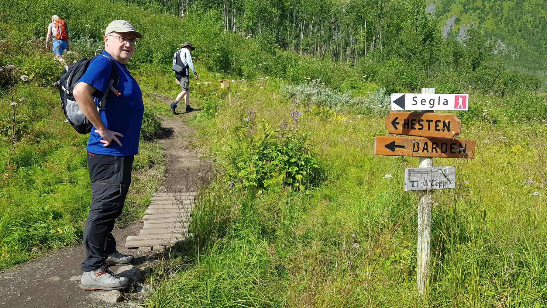 Husøy ist der erste Ort auf der Insel, der uns direkt positiv überrascht. Es gibt sogar einen Stellplatz unten im Hafen, für € 20/Nacht. Für einen einfachen Parkplatz finden wir das zu teuer und finden einen etwas seltsamen Platz für die Nacht, allerdings mit grandioser Aussicht. Wir stehen am Straßenrand, einer nicht stark befahrenen Straße, unmittelbar vor der Einfahrt zum Tunnel. Am kommenden Tag gehen wir 20 km entfernt, auf den Hesten mit Blick auf den Berg Segla. Eine sehr anstrengende Wanderung mit 430 Höhenmetern mit grandiosem Ausblick auf den Berg Segla und die Fjorde der Insel. Der Platz am Tunnel hat uns so gut gefallen, dass wir wieder zurück sind. Dieses Mal steigern wir unser „Camping am Tunnel“ und grillen alles was wir so haben. Die vorbeifahrenden Einheimischen grüßen nett.