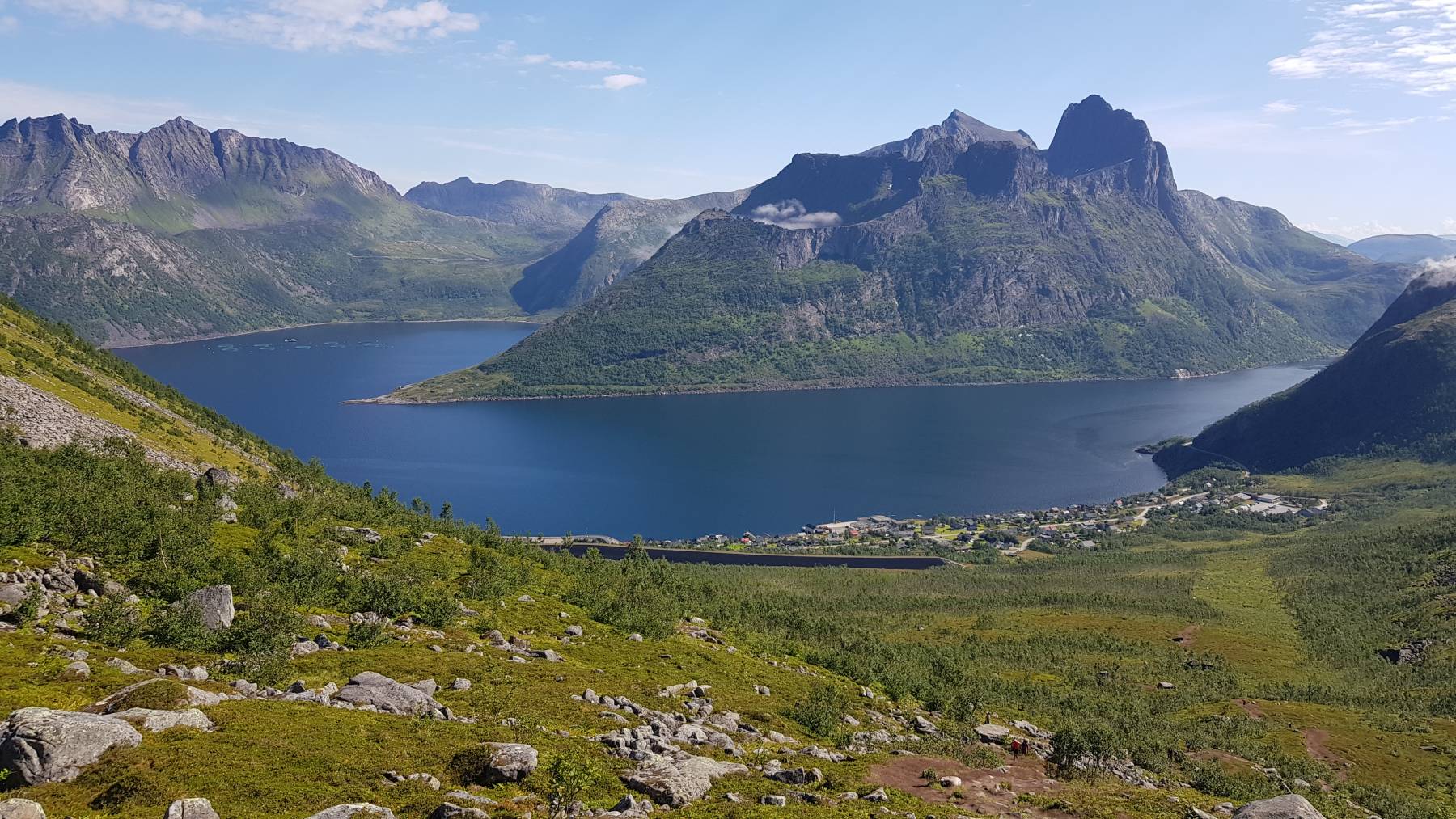 Husøy ist der erste Ort auf der Insel, der uns direkt positiv überrascht. Es gibt sogar einen Stellplatz unten im Hafen, für € 20/Nacht. Für einen einfachen Parkplatz finden wir das zu teuer und finden einen etwas seltsamen Platz für die Nacht, allerdings mit grandioser Aussicht. Wir stehen am Straßenrand, einer nicht stark befahrenen Straße, unmittelbar vor der Einfahrt zum Tunnel. Am kommenden Tag gehen wir 20 km entfernt, auf den Hesten mit Blick auf den Berg Segla. Eine sehr anstrengende Wanderung mit 430 Höhenmetern mit grandiosem Ausblick auf den Berg Segla und die Fjorde der Insel. Der Platz am Tunnel hat uns so gut gefallen, dass wir wieder zurück sind. Dieses Mal steigern wir unser „Camping am Tunnel“ und grillen alles was wir so haben. Die vorbeifahrenden Einheimischen grüßen nett.