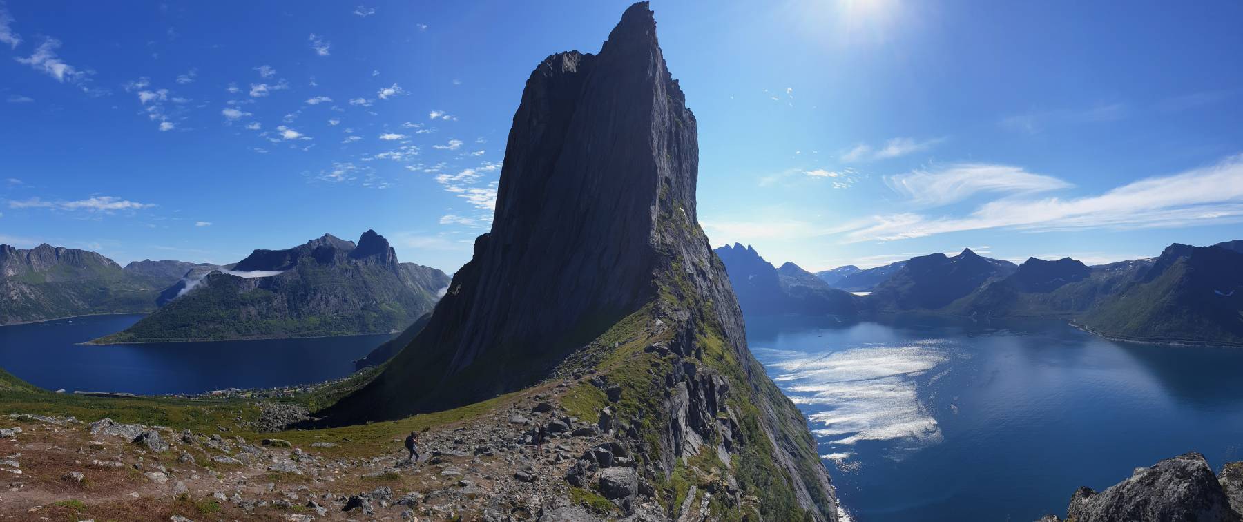 Husøy ist der erste Ort auf der Insel, der uns direkt positiv überrascht. Es gibt sogar einen Stellplatz unten im Hafen, für € 20/Nacht. Für einen einfachen Parkplatz finden wir das zu teuer und finden einen etwas seltsamen Platz für die Nacht, allerdings mit grandioser Aussicht. Wir stehen am Straßenrand, einer nicht stark befahrenen Straße, unmittelbar vor der Einfahrt zum Tunnel. Am kommenden Tag gehen wir 20 km entfernt, auf den Hesten mit Blick auf den Berg Segla. Eine sehr anstrengende Wanderung mit 430 Höhenmetern mit grandiosem Ausblick auf den Berg Segla und die Fjorde der Insel. Der Platz am Tunnel hat uns so gut gefallen, dass wir wieder zurück sind. Dieses Mal steigern wir unser „Camping am Tunnel“ und grillen alles was wir so haben. Die vorbeifahrenden Einheimischen grüßen nett.