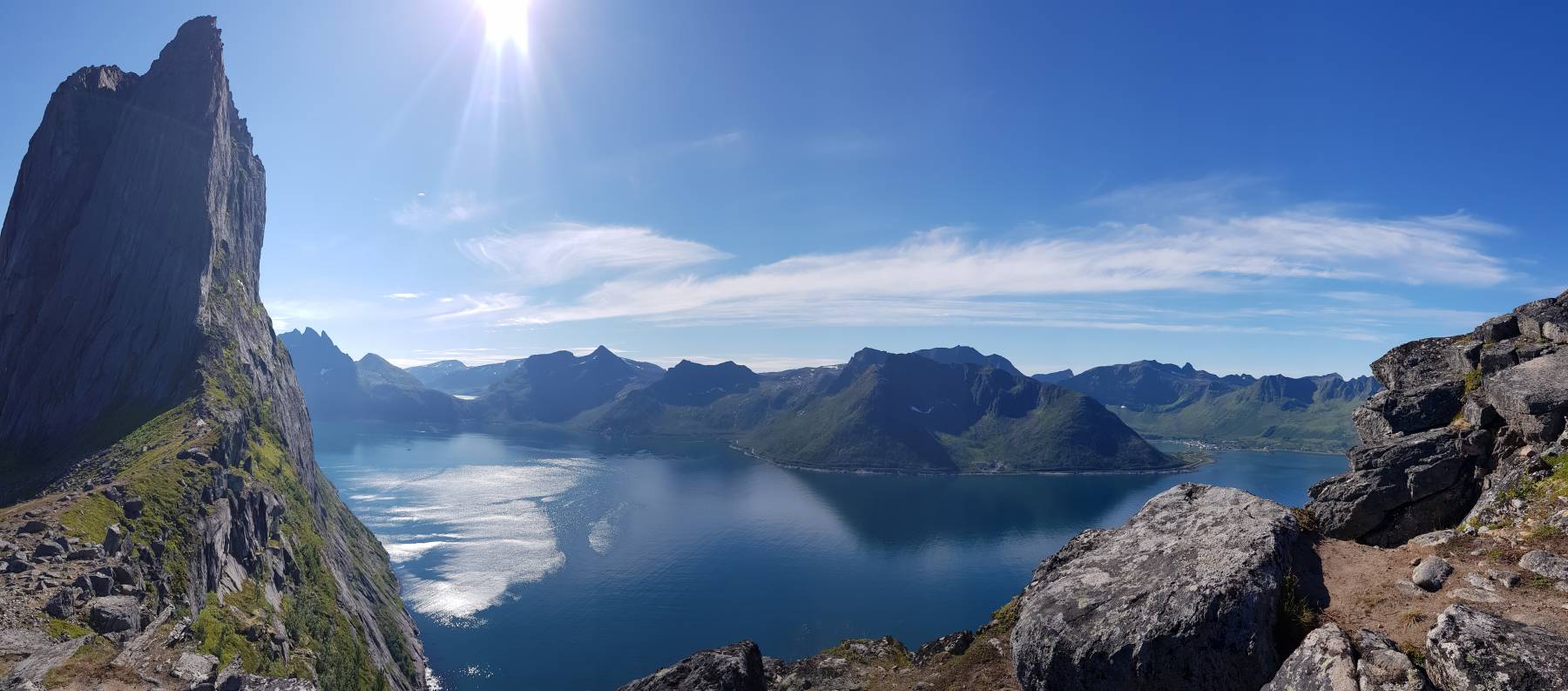 Husøy ist der erste Ort auf der Insel, der uns direkt positiv überrascht. Es gibt sogar einen Stellplatz unten im Hafen, für € 20/Nacht. Für einen einfachen Parkplatz finden wir das zu teuer und finden einen etwas seltsamen Platz für die Nacht, allerdings mit grandioser Aussicht. Wir stehen am Straßenrand, einer nicht stark befahrenen Straße, unmittelbar vor der Einfahrt zum Tunnel. Am kommenden Tag gehen wir 20 km entfernt, auf den Hesten mit Blick auf den Berg Segla. Eine sehr anstrengende Wanderung mit 430 Höhenmetern mit grandiosem Ausblick auf den Berg Segla und die Fjorde der Insel. Der Platz am Tunnel hat uns so gut gefallen, dass wir wieder zurück sind. Dieses Mal steigern wir unser „Camping am Tunnel“ und grillen alles was wir so haben. Die vorbeifahrenden Einheimischen grüßen nett.