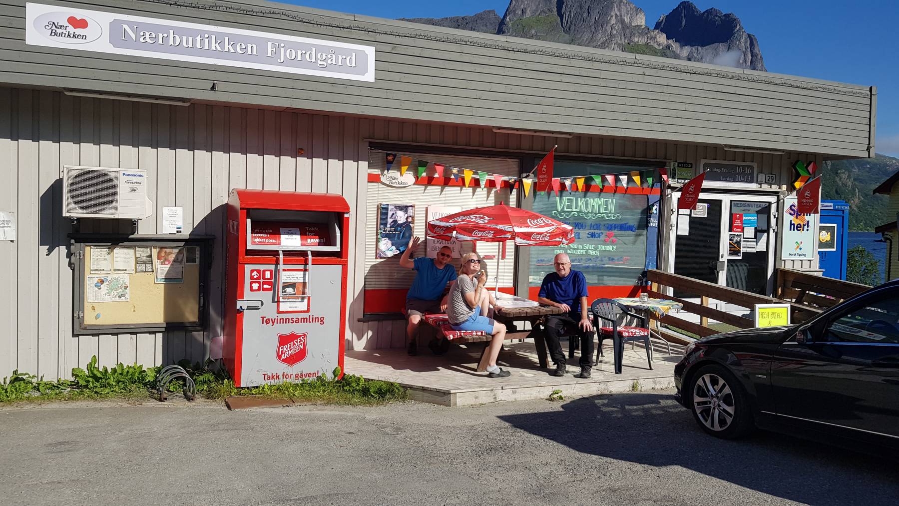 Husøy ist der erste Ort auf der Insel, der uns direkt positiv überrascht. Es gibt sogar einen Stellplatz unten im Hafen, für € 20/Nacht. Für einen einfachen Parkplatz finden wir das zu teuer und finden einen etwas seltsamen Platz für die Nacht, allerdings mit grandioser Aussicht. Wir stehen am Straßenrand, einer nicht stark befahrenen Straße, unmittelbar vor der Einfahrt zum Tunnel. Am kommenden Tag gehen wir 20 km entfernt, auf den Hesten mit Blick auf den Berg Segla. Eine sehr anstrengende Wanderung mit 430 Höhenmetern mit grandiosem Ausblick auf den Berg Segla und die Fjorde der Insel. Der Platz am Tunnel hat uns so gut gefallen, dass wir wieder zurück sind. Dieses Mal steigern wir unser „Camping am Tunnel“ und grillen alles was wir so haben. Die vorbeifahrenden Einheimischen grüßen nett.