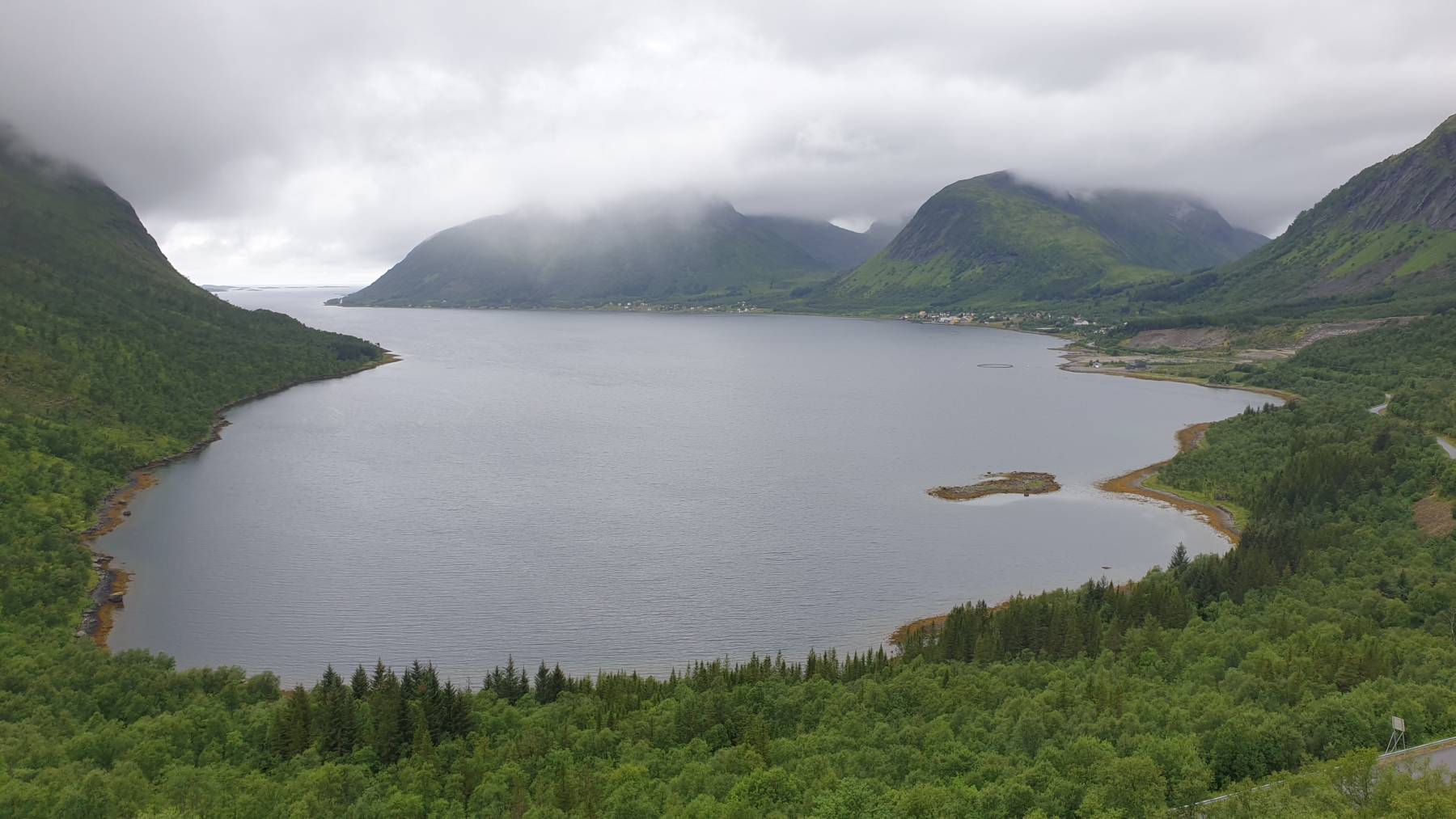 Husøy ist der erste Ort auf der Insel, der uns direkt positiv überrascht. Es gibt sogar einen Stellplatz unten im Hafen, für € 20/Nacht. Für einen einfachen Parkplatz finden wir das zu teuer und finden einen etwas seltsamen Platz für die Nacht, allerdings mit grandioser Aussicht. Wir stehen am Straßenrand, einer nicht stark befahrenen Straße, unmittelbar vor der Einfahrt zum Tunnel. Am kommenden Tag gehen wir 20 km entfernt, auf den Hesten mit Blick auf den Berg Segla. Eine sehr anstrengende Wanderung mit 430 Höhenmetern mit grandiosem Ausblick auf den Berg Segla und die Fjorde der Insel. Der Platz am Tunnel hat uns so gut gefallen, dass wir wieder zurück sind. Dieses Mal steigern wir unser „Camping am Tunnel“ und grillen alles was wir so haben. Die vorbeifahrenden Einheimischen grüßen nett.