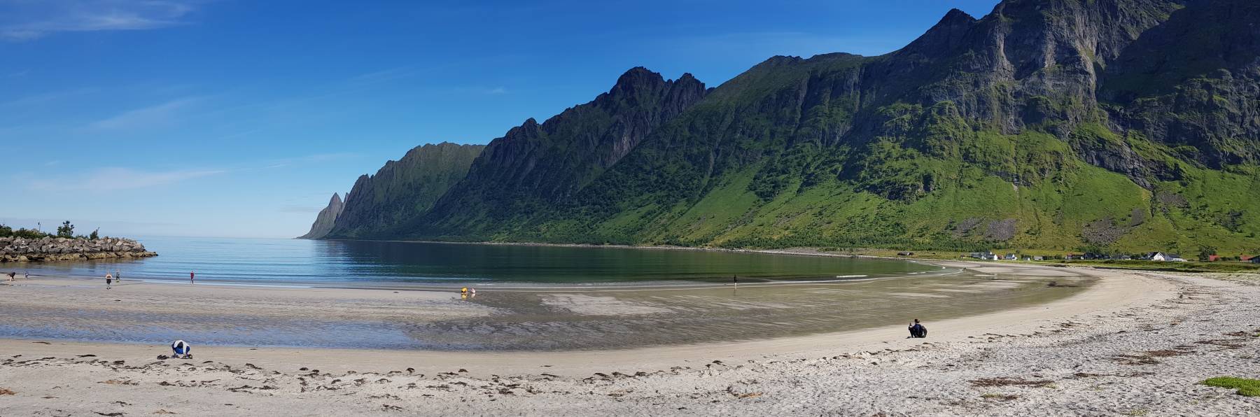 Husøy ist der erste Ort auf der Insel, der uns direkt positiv überrascht. Es gibt sogar einen Stellplatz unten im Hafen, für € 20/Nacht. Für einen einfachen Parkplatz finden wir das zu teuer und finden einen etwas seltsamen Platz für die Nacht, allerdings mit grandioser Aussicht. Wir stehen am Straßenrand, einer nicht stark befahrenen Straße, unmittelbar vor der Einfahrt zum Tunnel. Am kommenden Tag gehen wir 20 km entfernt, auf den Hesten mit Blick auf den Berg Segla. Eine sehr anstrengende Wanderung mit 430 Höhenmetern mit grandiosem Ausblick auf den Berg Segla und die Fjorde der Insel. Der Platz am Tunnel hat uns so gut gefallen, dass wir wieder zurück sind. Dieses Mal steigern wir unser „Camping am Tunnel“ und grillen alles was wir so haben. Die vorbeifahrenden Einheimischen grüßen nett.
