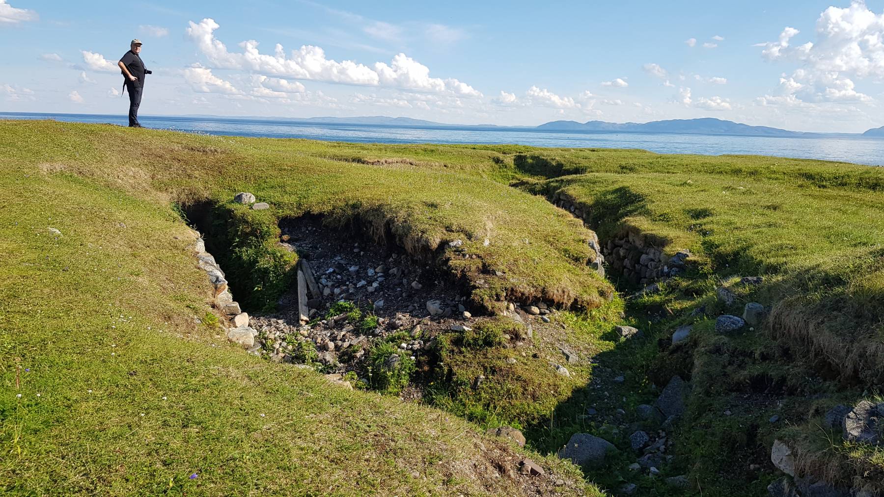 Ein 360° Foto von Vadso: Direkt vorne sind die alten deutschen Schützengräben, in der Ferne dahinter ist Russland. Vadsø als Ort ist im Hintergrund zu erkennen und der große rote Mast ist der berühmte Luftschiff-Ankermast. Nach unten sieht man zwei Touristen 😎😂.