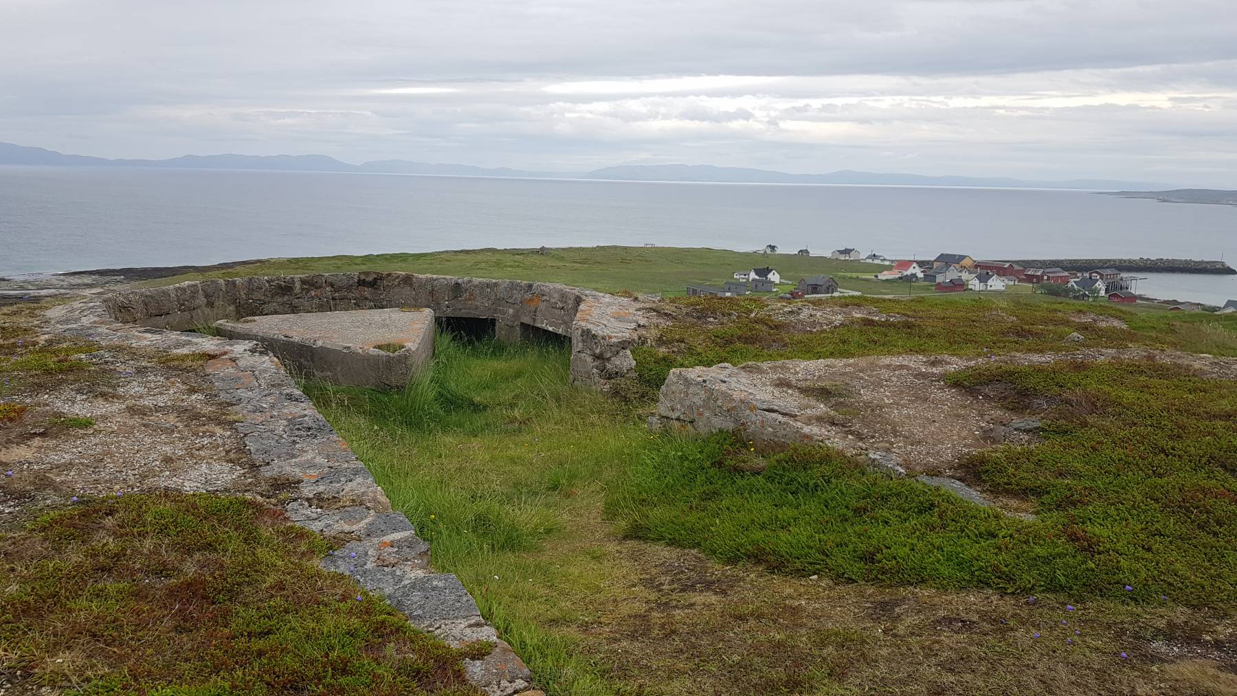 Ein 360° Foto von Vadso: Direkt vorne sind die alten deutschen Schützengräben, in der Ferne dahinter ist Russland. Vadsø als Ort ist im Hintergrund zu erkennen und der große rote Mast ist der berühmte Luftschiff-Ankermast. Nach unten sieht man zwei Touristen 😎😂.