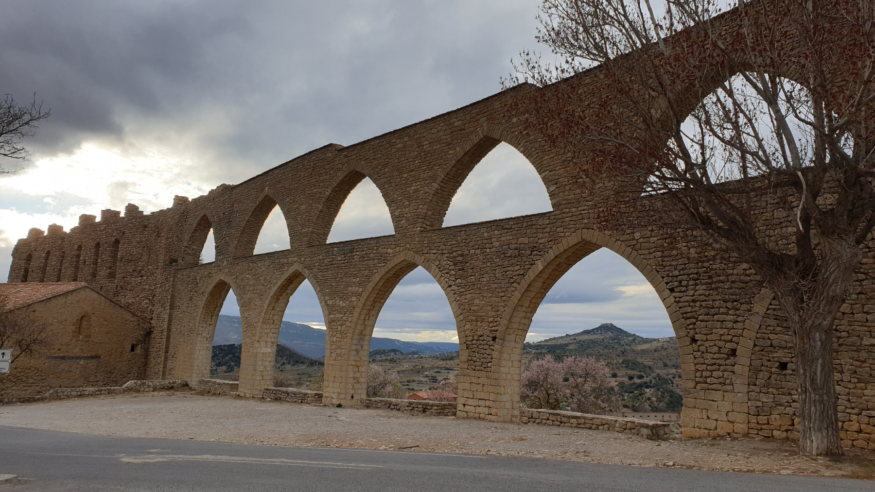 Die Wahl zwischen Küste und Hinterland fällt zu Gunsten des Hinterlandes. Durch die Sierra der Provinz Castellon. Die Fahrt führt ins Mittelgebirge auf über 1.000m Höhe. In Morella finden wir einen Platz mit Blick auf die Stadt. Das Wetter ist trüb und kühl geworden – 8 Grad – und es regnet.