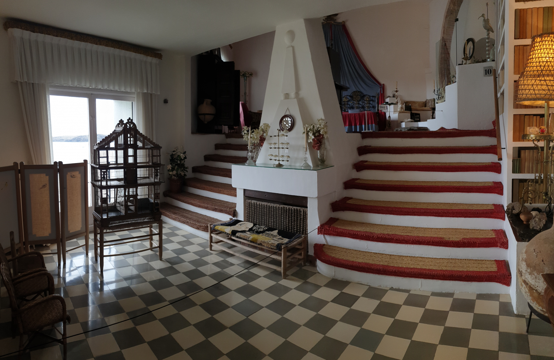 Das Dali-Museum in Figueras haben wir schon mal besucht. Das Wohnhaus des 1989 verstorbenen Künstlers, der unser beider Jugend mit geprägt hatte, wollen wir uns jetzt angucken. Dafür geht es in den nördlichsten Zipfel der Costa Brava nach Portlligat. An unzähligen Womo-Verbotsschildern – Park- und Fahrverbote – in den verschiedensten Orten vorbeifahrend, landen wir in dem kleinen Fischerort. Wir lesen, dass ein Zutritt nur nach vorheriger Reservierung möglich ist und nur in 6er Gruppen. Wir gehen trotzdem hin, zahlen € 14 pro Person und erfahren, dass es in 2 Minuten los geht und wir den Foto-Rucksack gegenüber einschließen müssen. Fotografieren dürfen wir. Also alles super!