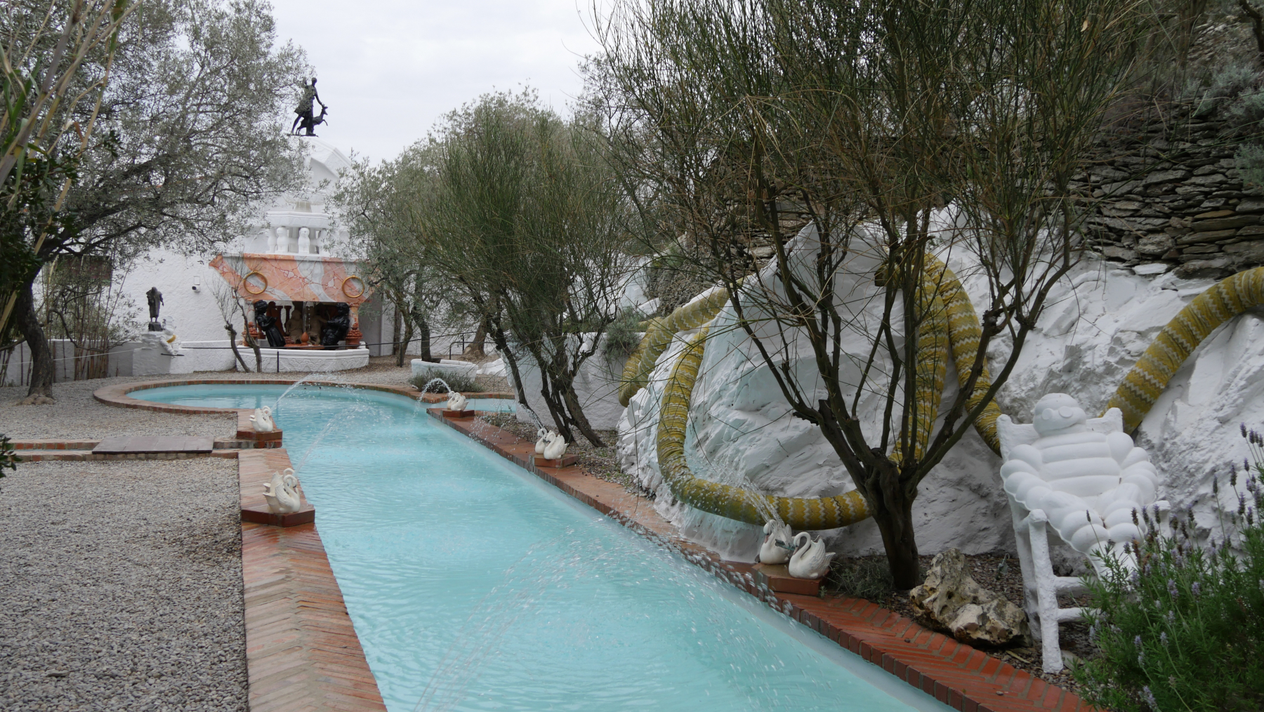 Das Dali-Museum in Figueras haben wir schon mal besucht. Das Wohnhaus des 1989 verstorbenen Künstlers, der unser beider Jugend mit geprägt hatte, wollen wir uns jetzt angucken. Dafür geht es in den nördlichsten Zipfel der Costa Brava nach Portlligat. An unzähligen Womo-Verbotsschildern – Park- und Fahrverbote – in den verschiedensten Orten vorbeifahrend, landen wir in dem kleinen Fischerort. Wir lesen, dass ein Zutritt nur nach vorheriger Reservierung möglich ist und nur in 6er Gruppen. Wir gehen trotzdem hin, zahlen € 14 pro Person und erfahren, dass es in 2 Minuten los geht und wir den Foto-Rucksack gegenüber einschließen müssen. Fotografieren dürfen wir. Also alles super!
