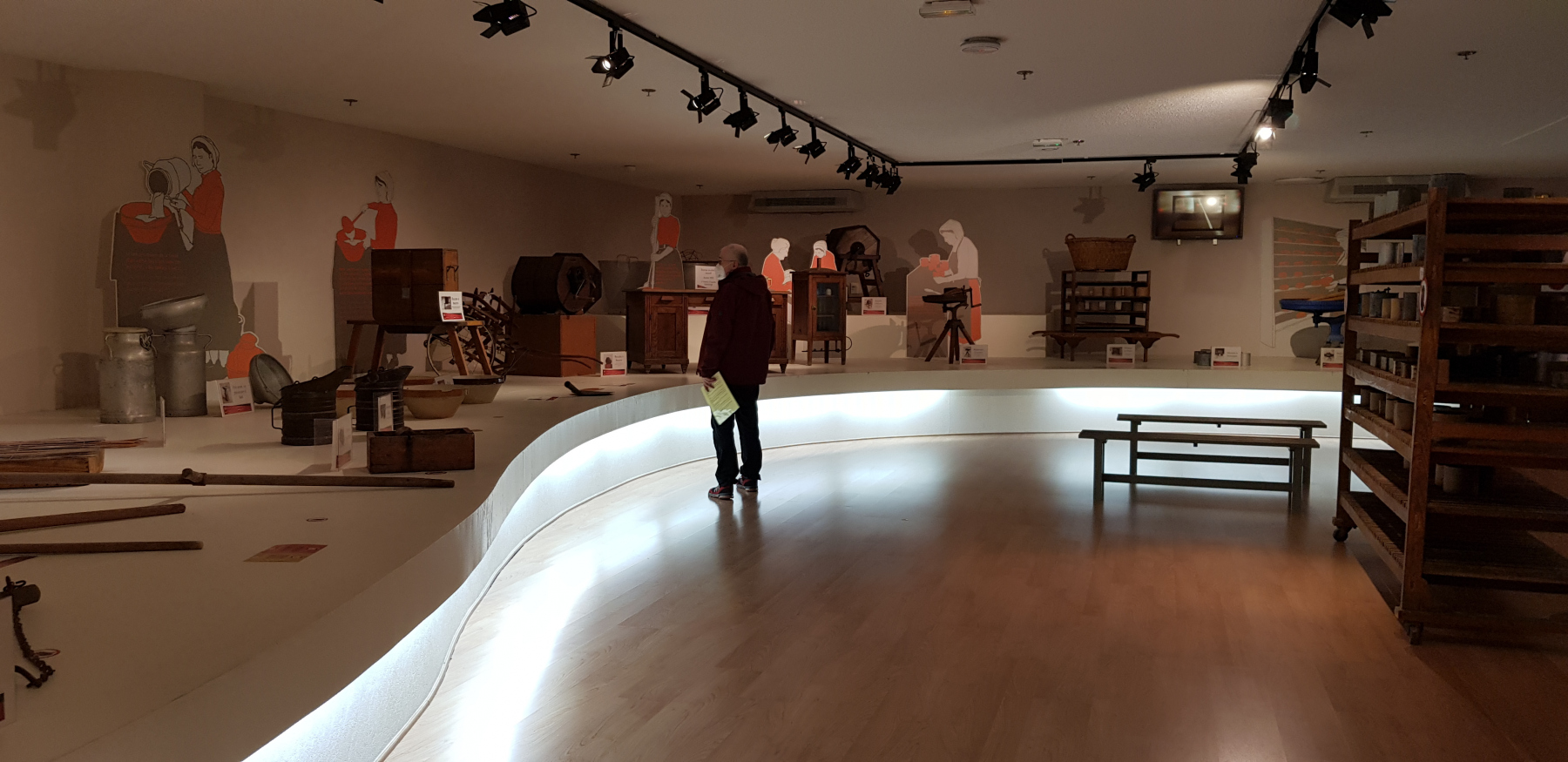 Was aber einfach klasse ist und sich lohnt. Nach kurzer Orientierung gehen wir nach rechts und gehen durch die kostenlose Ausstellung und kommen zur LiveProduktion. Gut, wir sind etwas spät dran, die machen die Gerätschaften für die Herstellung gerade sauber. Immerhin sehen wir noch etwas vom Verpacken und das für Livarot typische umbinden des Riedgrases.